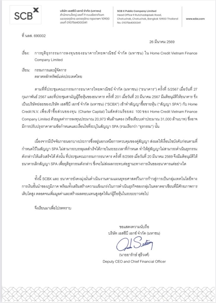 ผู้สื่อข่าวรายงานว่า บริษัท เอสซีบี เอกซ์ จำกัด (มหาชน) (SCBX) แจ้งต่อตลาดหลักทรัพย์แห่งประเทศไทย (ตลท.) เรื่อง การยุติธุรกรรมการลงทุนของธนาคารไทยพาณิชย์ จำกัด (มหาชน) ใน Home Credit Vietnam Finance Company Limited