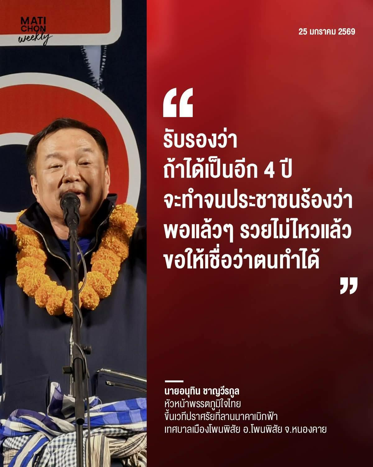 ย้อนไปเมื่อวันที่ 25 ม.ค. ที่ลานนาคาเบิกฟ้า ริมแม่น้ำโขงเทศบาลเมืองโพนพิสัย อ.โพนพิสัย จ.หนองคาย นายอนุทิน ชาญวีรกูล หัวหน้าพรรตภูมิใจไทย ขึ้นเวทีปราศรัยช่วย พล.ต.ท.ไพศาล ลือสมบูรณ์ ผู้สมัคร สส.เขต 1 , นางจิดาภา สุนทรธนากุล ผู้สมัคร สส.เขต 2 และนายศักดิ์ดา จันทรสุวรรณ ผู้สมัคร สส.เขต 3 หาเสียง