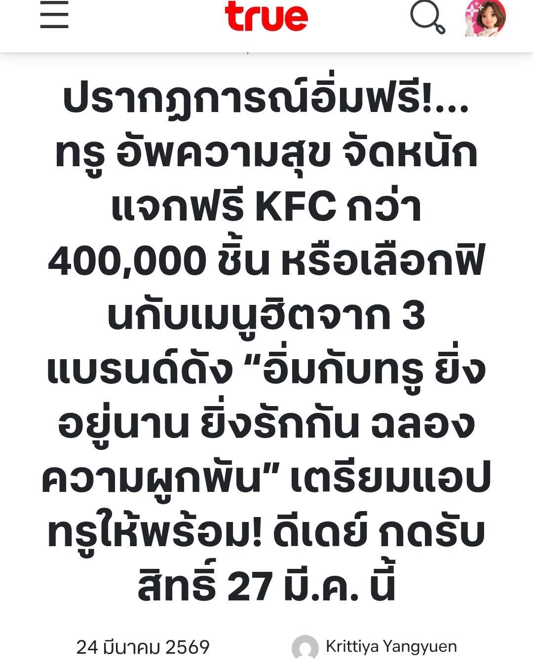 [Spoil] คลิกเพื่อดูข้อความที่ซ่อนไว้ปรากฏการณ์อิ่มฟรี!…ทรู อัพความสุข จัดหนักแจกฟรี KFC กว่า 400,000 ชิ้น หรือเลือกฟินกับเมนูฮิตจาก 3 แบรนด์ดัง “อิ่มกับทรู ยิ่งอยู่นาน ยิ่งรักกัน ฉลองความผูกพัน” เตรียมแอปทรูให้พร้อม! ดีเดย์ กดรับสิทธิ์ 27 มี.ค. นี้ - True Blog