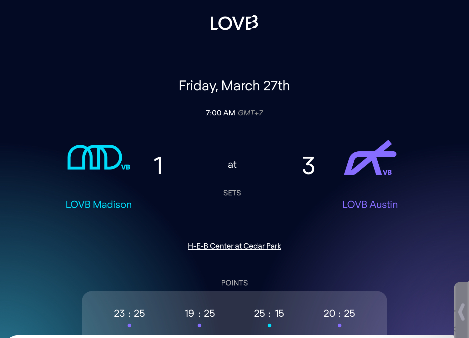 LOVB Madison🩵 1-3 LOVB Austin💜 (23-25 19-25 25-15 20-25)