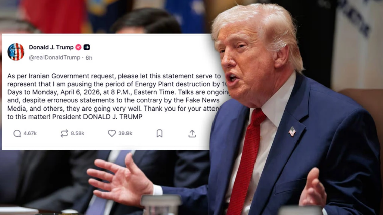 โพสต์ข้อความใน Truth Social ว่า “ตามคำร้องขอของรัฐบาลอิหร่าน ขอให้ถ้อยแถลงฉบับนี้ถือเป็นการยืนยันว่า ผมจะระงับช่วงเวลาของการทำลายโรงงานพลังงานออกไปอีก 10 วัน จนถึงวันจันทร์ที่ 6 เมษายน 2026 เวลา 20.00 น. ตามเวลาฝั่งตะวันออก (Eastern Time)