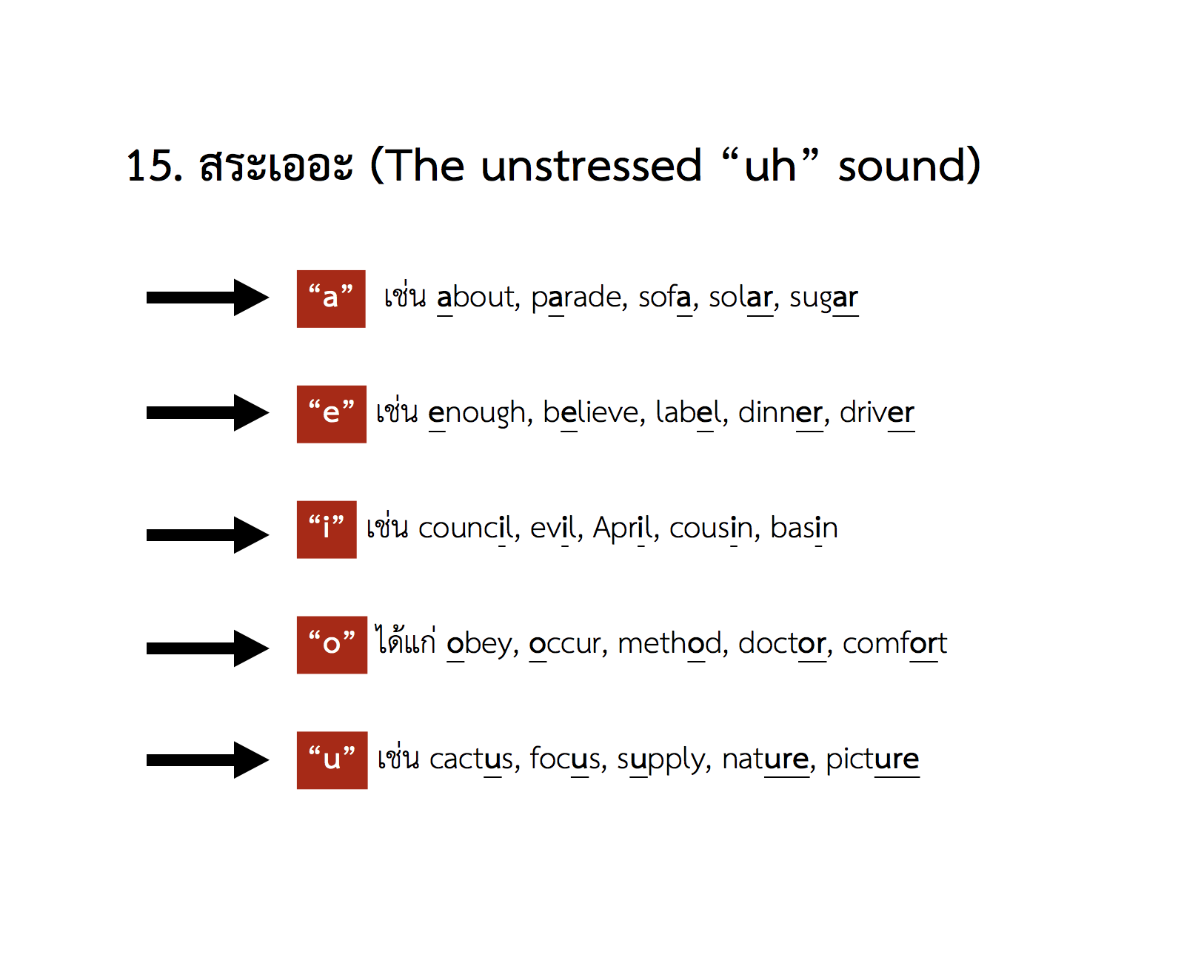 15. สระเออะ (The unstressed “uh” sound —> /ə/) สามารถสะกดเป็น A, E, I, O, U (และอื่น ๆ)
