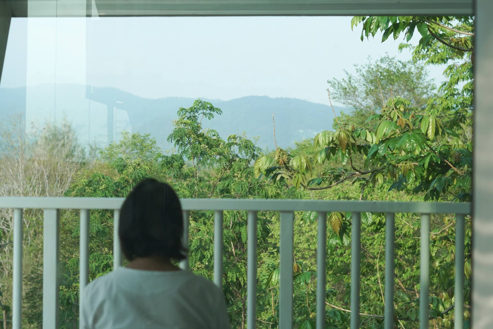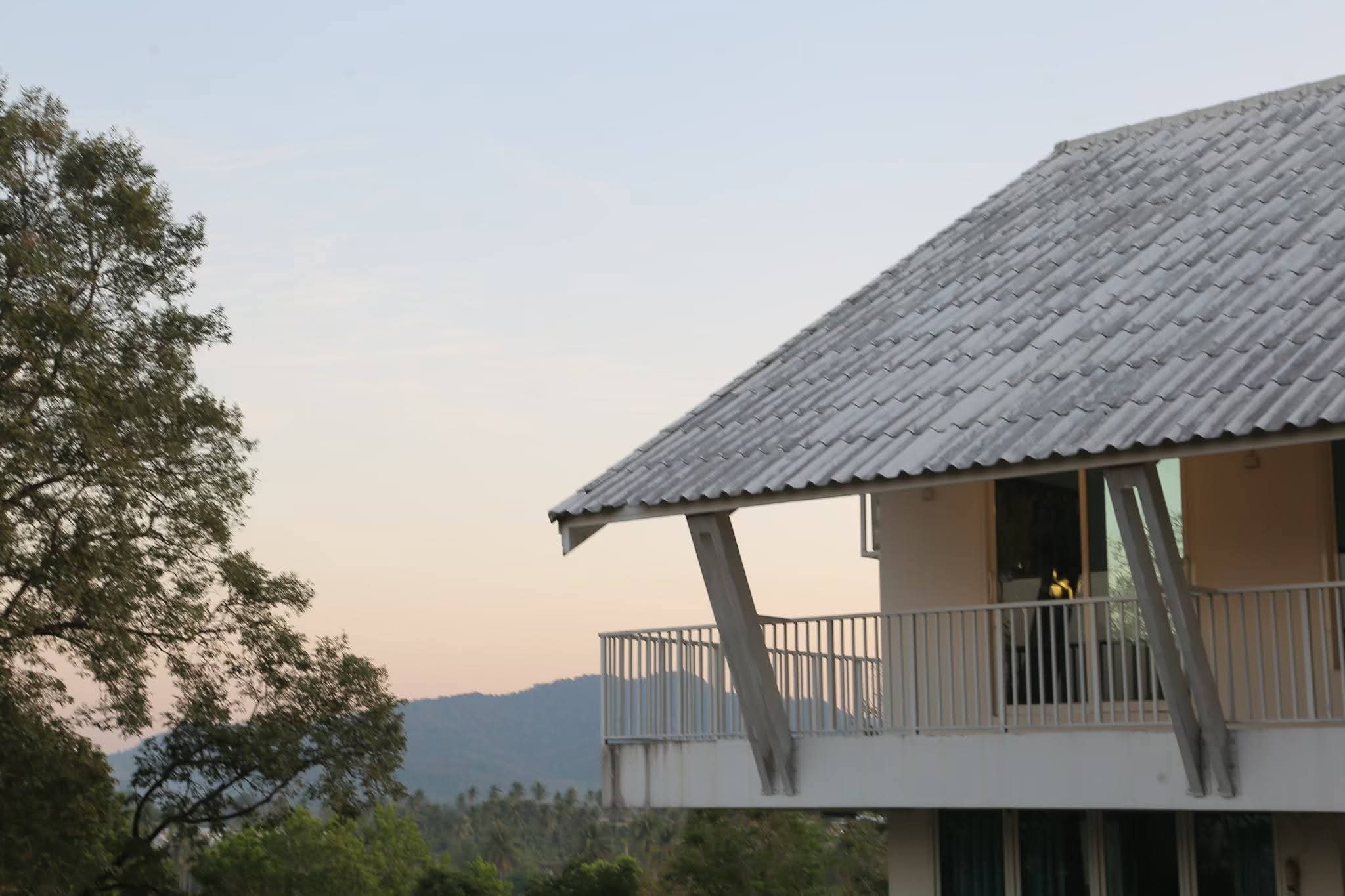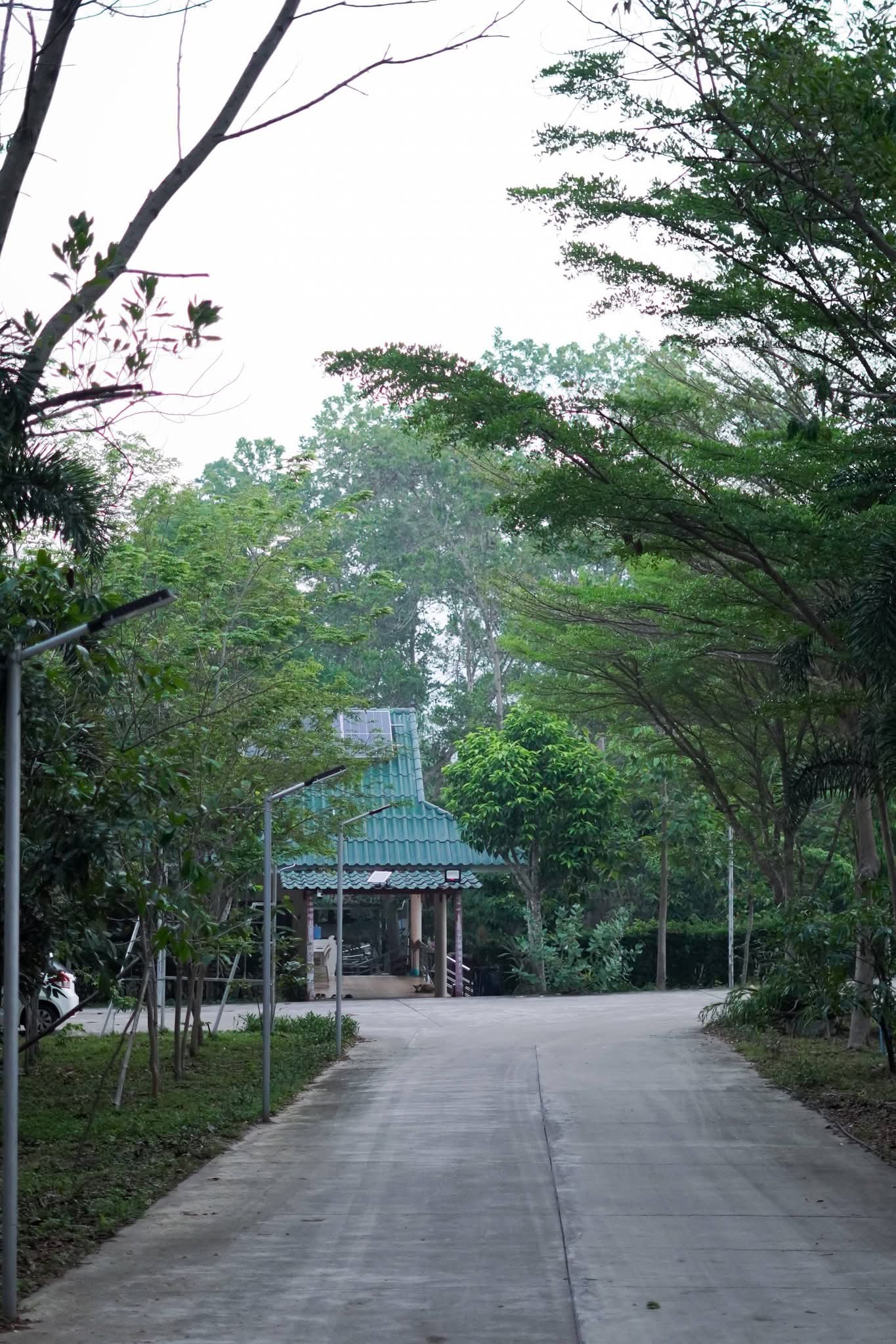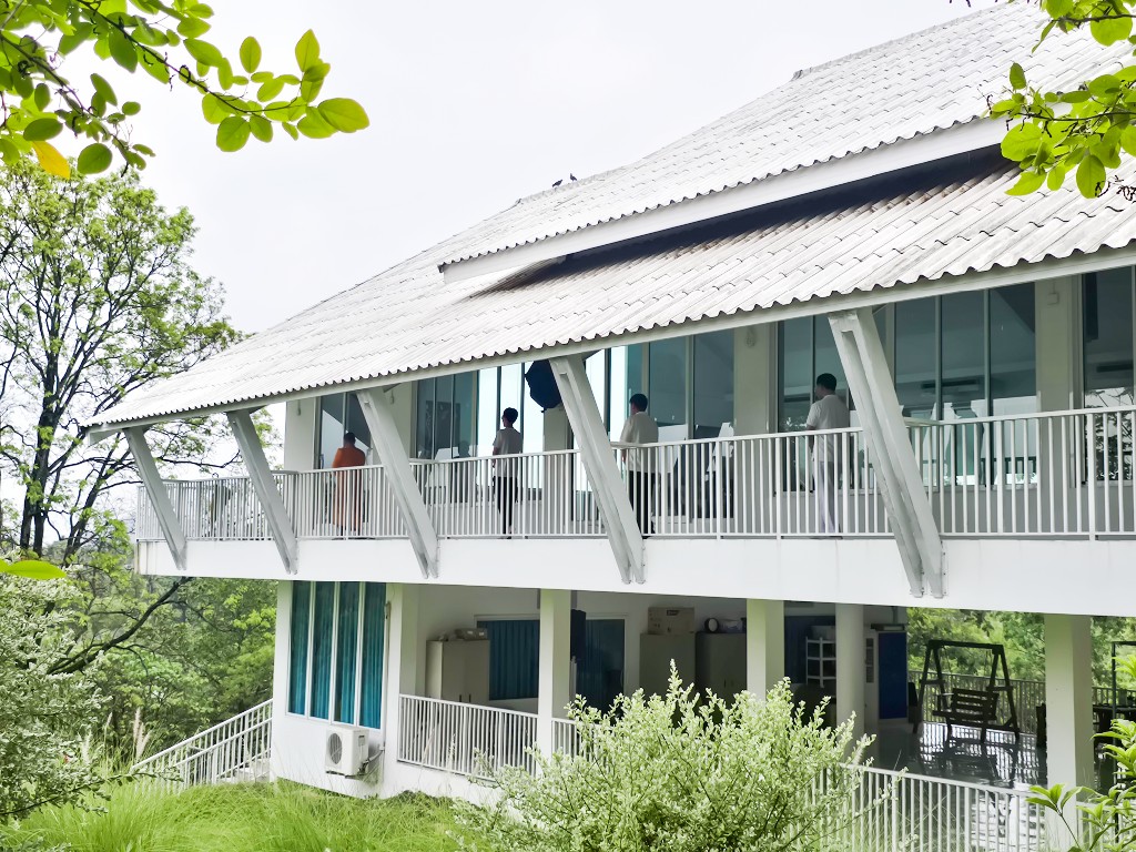 ทัศนียภาพมุมกว้างของศูนย์ปฏิบัติธรรมที่เห็นต้นไม้และภูเขา