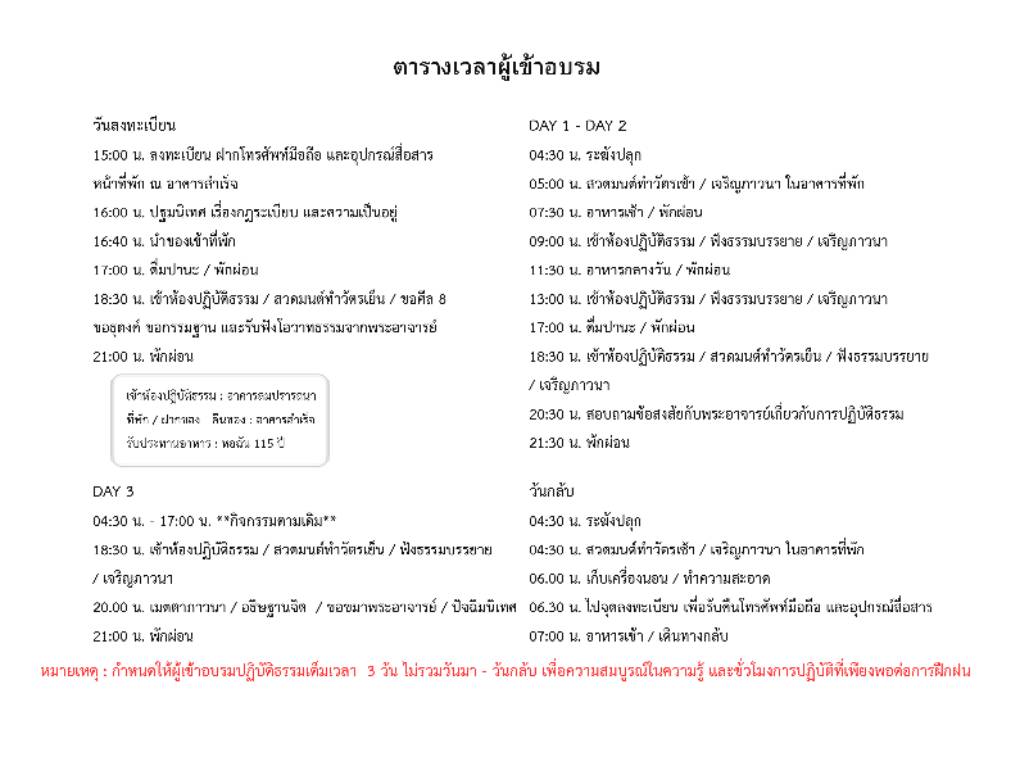 *ไม่มีกิจกรรมอื่น นอกจากฟังธรรมะปฏิบัติ และการปฏิบัติ