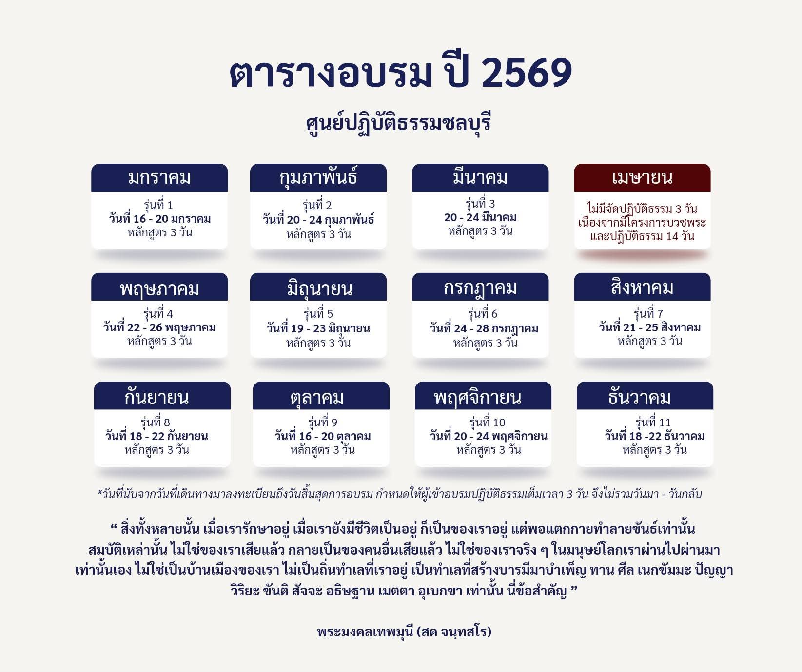 สำหรับท่านที่สนใจเข้าร่วมโครงการในปีนี้ เนื่องจากแต่ละรุ่นจำกัดเพียง ๑๒ ท่าน เพื่อความทั่วถึงในการดูแล ทางศูนย์ฯแนะนำให้ติดต่อล่วงหน้า