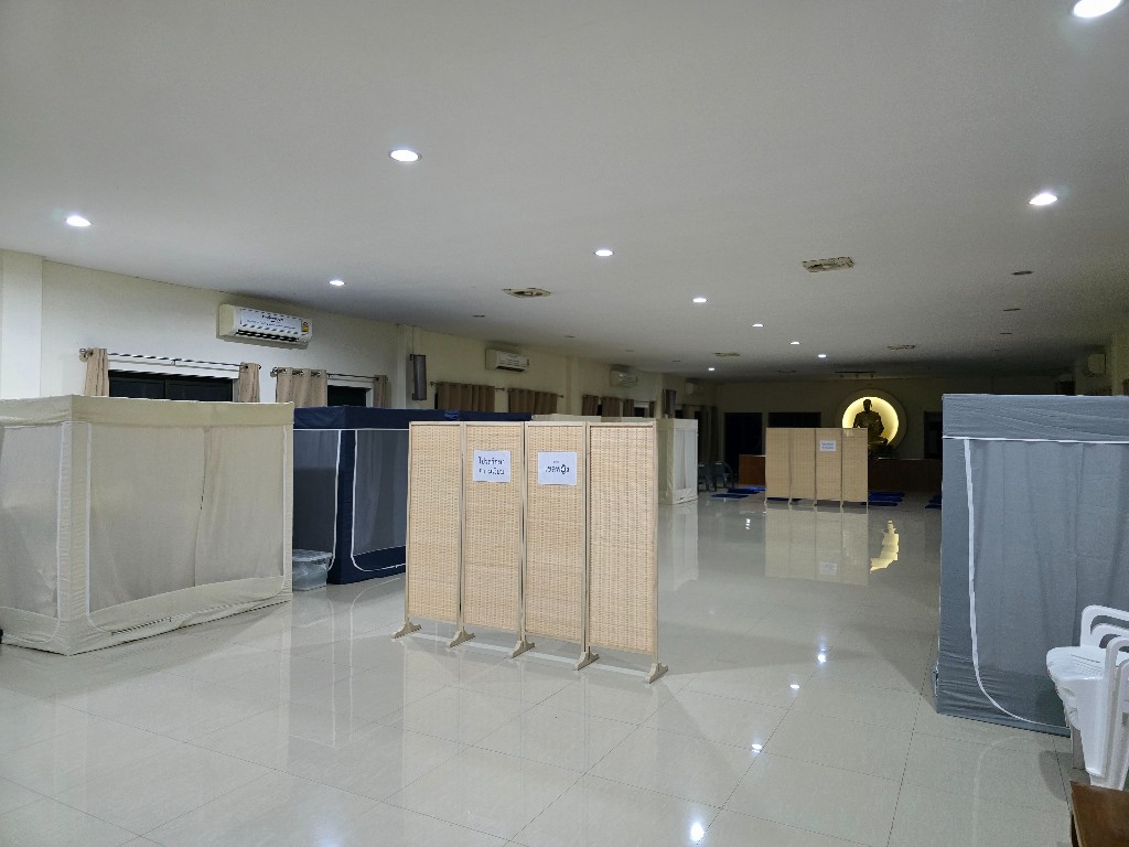 ภายในศาลาปฏิบัติธรรมที่จัดอาสนะไว้อย่างมีระเบียบ