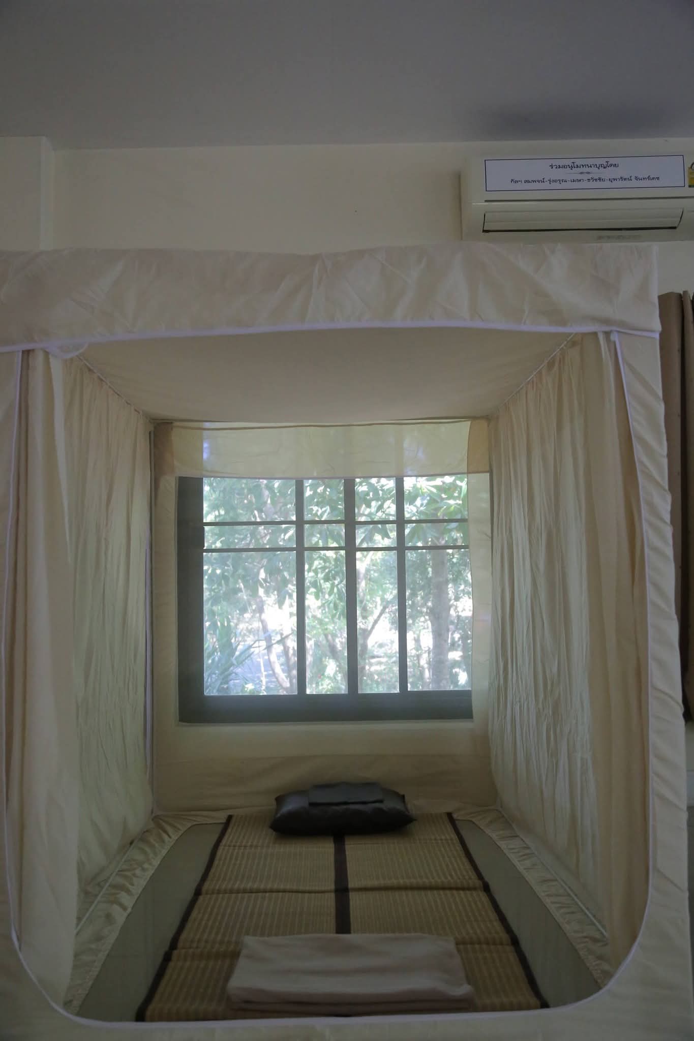 : อาคารที่พักซึ่งแยกสัดส่วนชัดเจนและดูเรียบง่าย นอนแอร์ มีมุ้งส่วนตัว บ้านพักชาย ไม่มีรูปไม่ได้ถ่ายมามีนอนกุฏิเดี่ยว กับนอนแอร์ รวม หนาวสามารถขอผ้าห่มเพิ่มได้