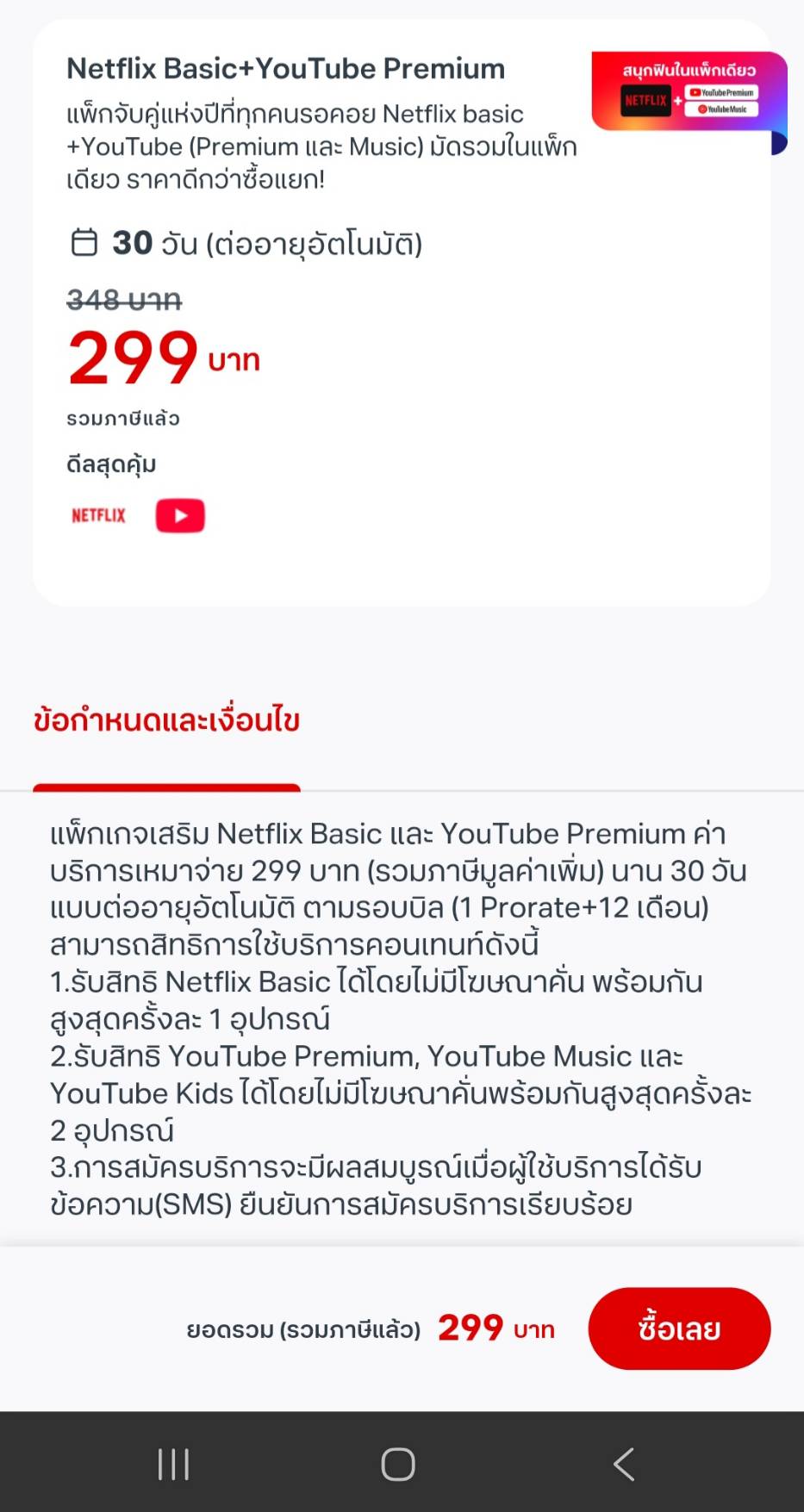 เมื่อวานมี Tele sale โทรมาเสนอแพคเกจ Netflix + Youtube Premium ในราคา 299 ผมบอกไปว่าผมใช้ Netflix Premium ที่จ่ายผ่าน True อยู่แล้วในราคา 400 กว่าบาท แต่ แพคเกจที่เสนอมาเป็นแค่ Netflix Basic ก็เลยถามไ