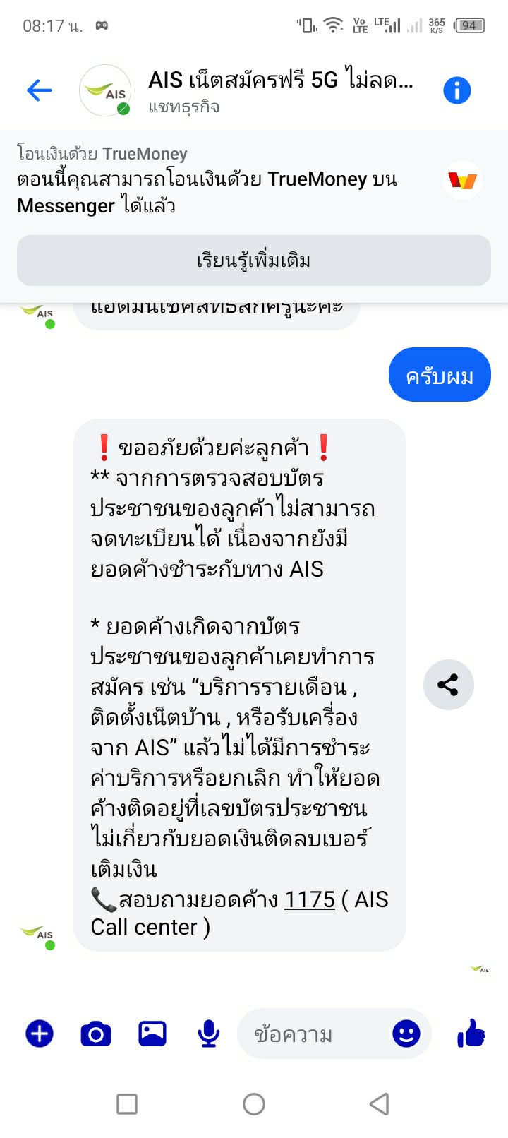 คือค้างค่าเครื่องของ AIS แต่ชำระหมดแล้วเมื่อ 5 ปีก่อนแต่พอจะมาสมัครเน็ตรายเดือนเราไม่สามารถสมัครเน็ตได้