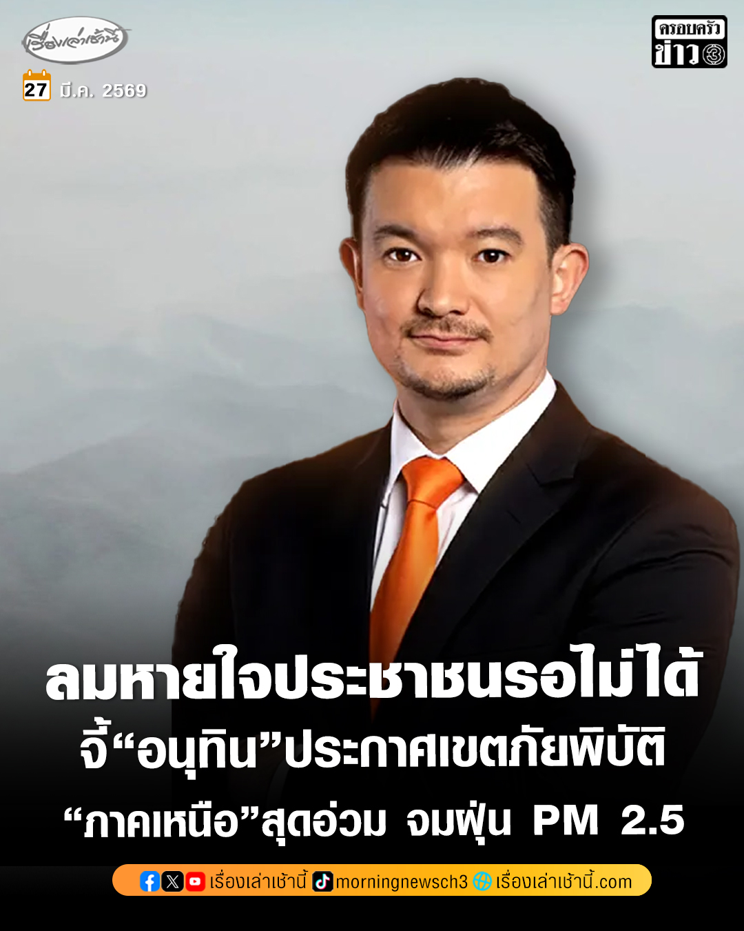 ผมขอเรียกร้องให้รัฐบาลดำเนินการประกาศเขตภัยพิบัติกรณี PM2.5 กับภาคเหนือตอนบนโดยด่วน ยกเลิกเกณฑ์ปัจจุบันที่เขียนจากคนในห้องแอร์ และประกาศภัยพิบัติเป็นภัยระดับ 3 ให้รัฐมนตรีกว่าการกระทรวงมหาดไทย นั่งหัวโต๊ะบัญชาการ พร้อมตั้งแผนการจัดการเร่งด่วนทั้งการจัดการที่ต้นตอของฝุ่นภายในประเทศ และการลดผลกระทบทางสุขภาพของประชาชน โดยใช้งบฉุกเฉินจากเงินทดรองราชการโดยทันที ภาพถ่ายทางอากาศของเชียงใหม่ในวันนี้ ฝุ่นพิษ PM2.5 หนักมาก แต่ทุกคนรู้ไหม หนักขนาดนี้ ยังไม่เข้าเกณฑ์ประกาศเขตภัยพิบัติ เพราะรัฐบาลตั้งเกณฑ์ไว้ว่าค่า PM2.5 เฉลี่ย 24 ชั่วโมง ต้องมากกว่า 125 ไมโครกรัมต่อลูกบาศก์เมตรต่อเนื่องกันเกิน 5 วันถึงจะประกาศได้