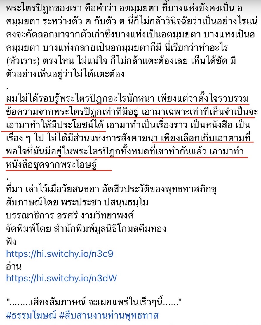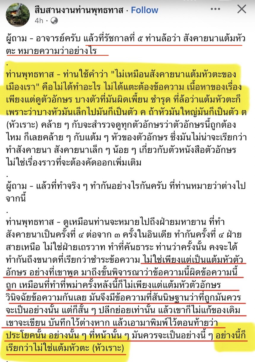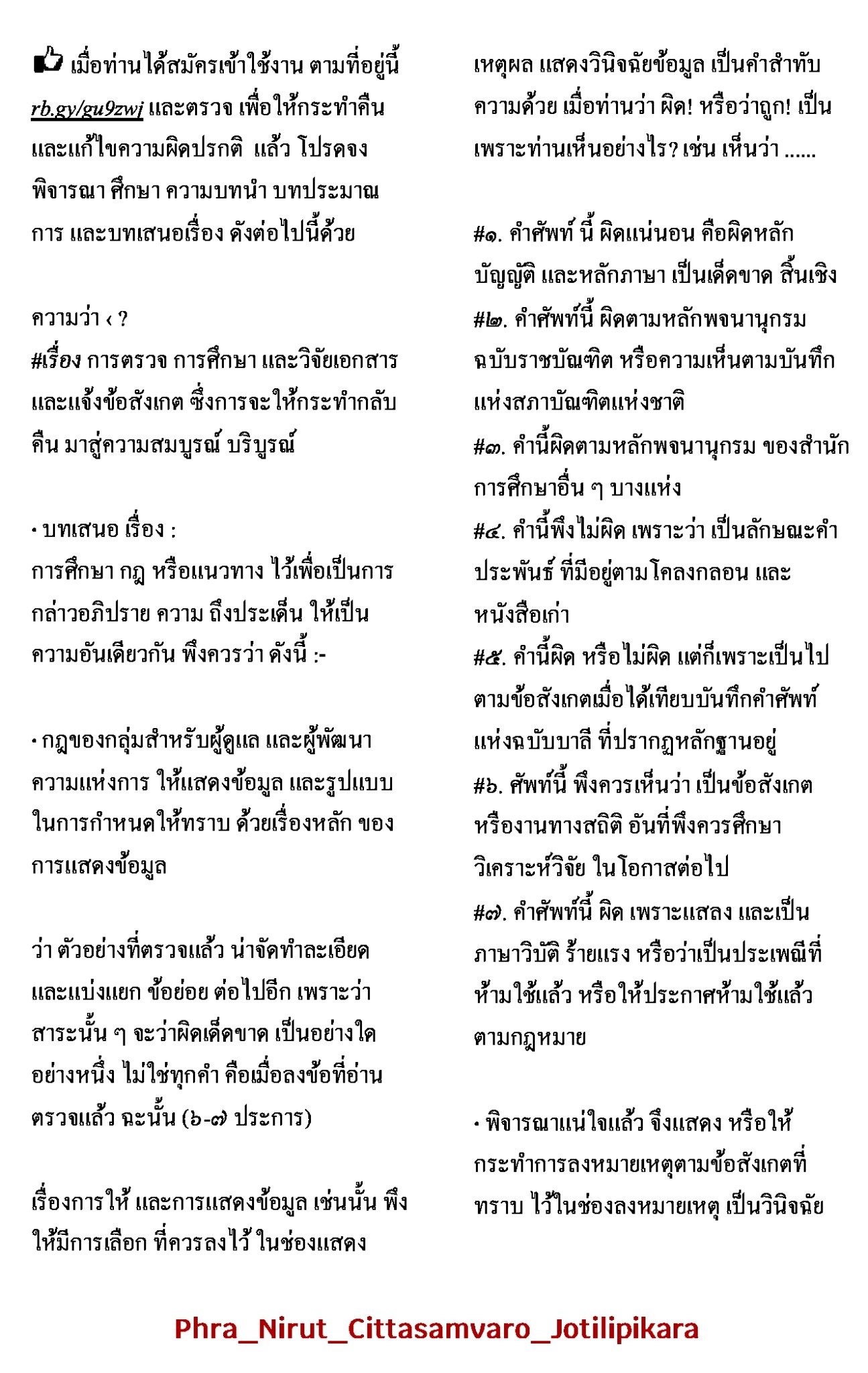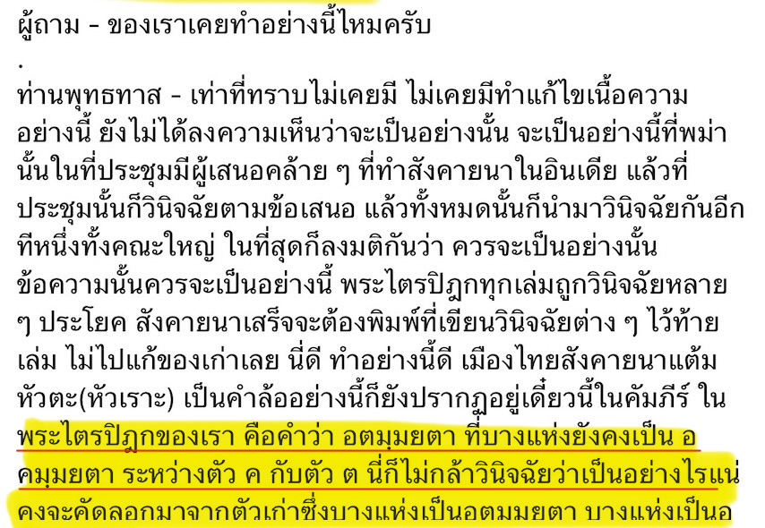 ที่นี้ ย้อนคืนมาดู ก็ขอแก้ความ หรือขยายความ ที่ประมาท หรือปรามาส ความสุจริต ของกันและกัน ของเพื่อนผู้ที่เป็นสมาชิก คือโดยสมาชิกที่ไม่ได้รู้ โดยทำนองนั้น หรือโดยสมาชิก ไม่ได้รู้โดยทำนองโน้น ฉะนั้น ขอแก้! ว่า ประการที่รู้ที่ศึกษา ตามกลุ่มงาน ที่ได้ปรากฏ เริ่มคิด เริ่มอ่าน เริ่มวิเคราะห์ (จากกลุ่ม ประมาณ ๔๐ คน ถึง ประมาณ ๒ พันคน) คือต้องแก้ว่า ที่โจทกัน ว่า ไม่รู้เรื่องพระไตรปิฎก แล้วจะทำงานพระไตรปิฎก (ไปทำไมหว่า!)