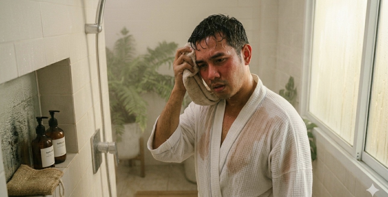 • หลังอาบ: เมื่อหยุดอาบน้ำ ร่างกายยังมีอุณหภูมิสะสมอยู่สูง ประกอบกับความชื้นในห้องน้ำที่หนาแน่น ทำให้เหงื่อระเหยไม่ได้ ร่างกายจึงต้องรีบขับเหงื่อออกมาอย่างหนักเพื่อ "คูลดาวน์" ตัวเองลงอย่างรวดเร็ว