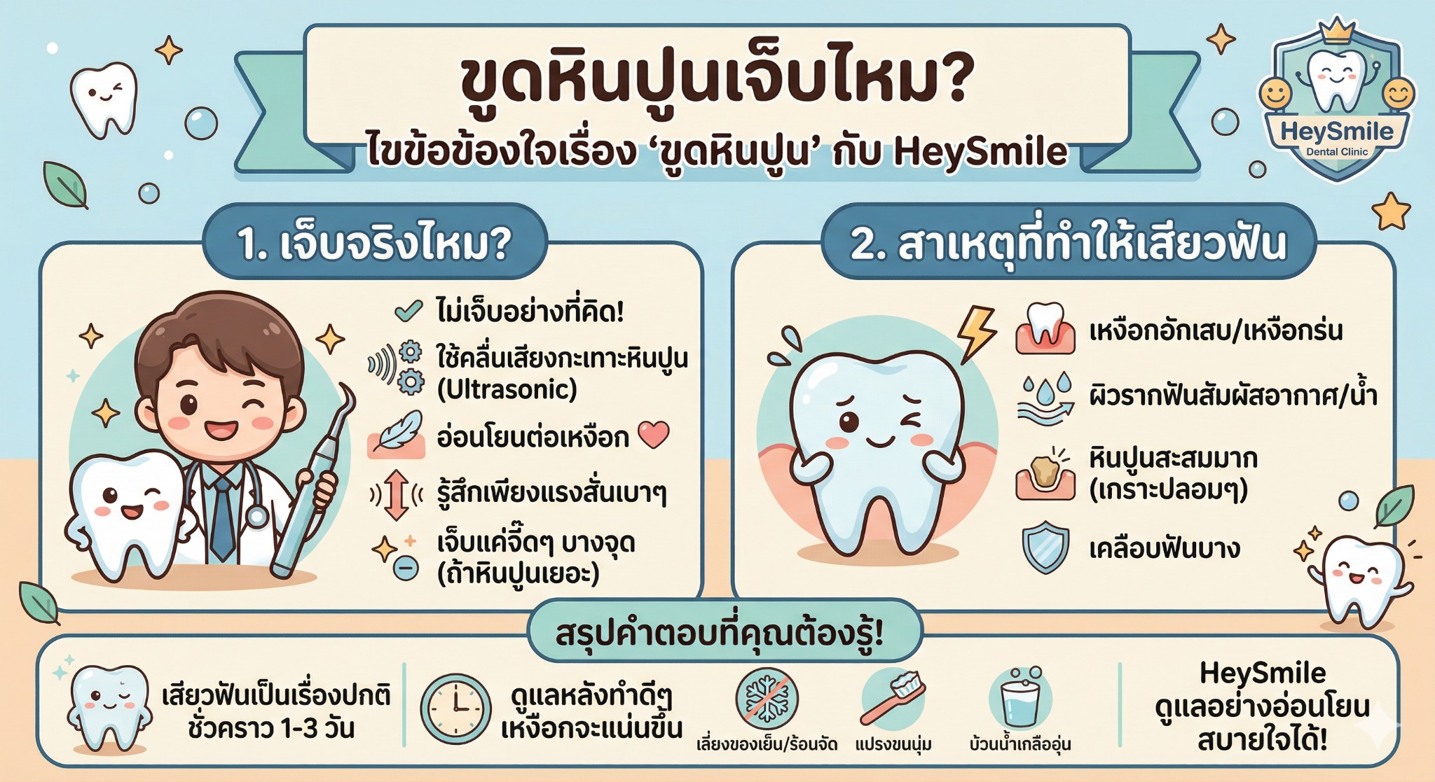 สรุปแล้ว การขูดหินปูนไม่ได้น่ากลัวอย่างที่คิดครับ เป็นการลงทุนเพื่อสุขภาพฟันที่คุ้มค่ามากๆ ใครที่กำลังมองหาคลินิกทำฟันที่มือเบา เครื่องมือทันสมัย และสามารถใช้สิทธิ์ประกันสังคมได้ แวะมาปรึกษาที่ HeySmile Dental Clinic ได้เลยนะครับ!