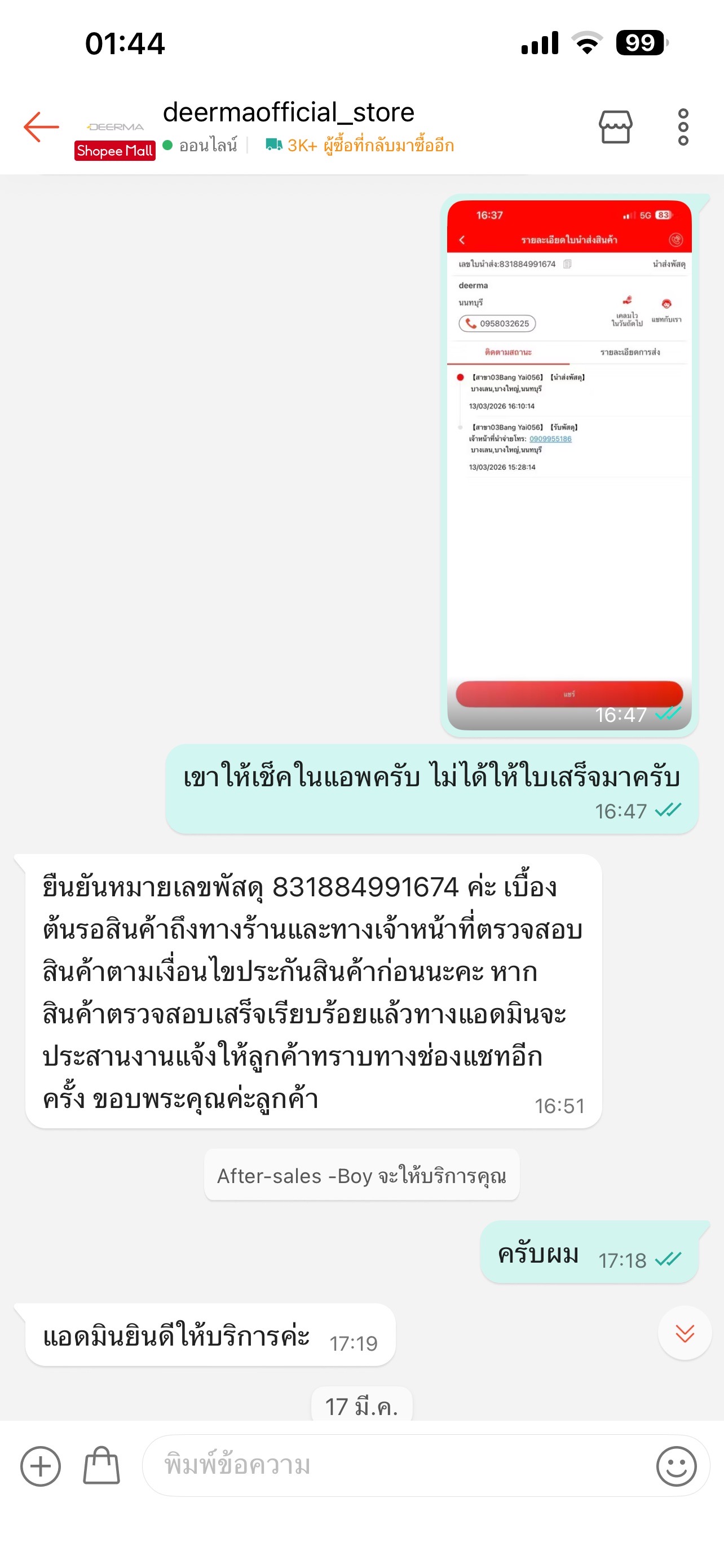 อ่านแชทโทรไปไม่รับสายเลย ซึ่งบริษัทรับสินค้าไปตั้งแต่วันที่ 14 มีนา