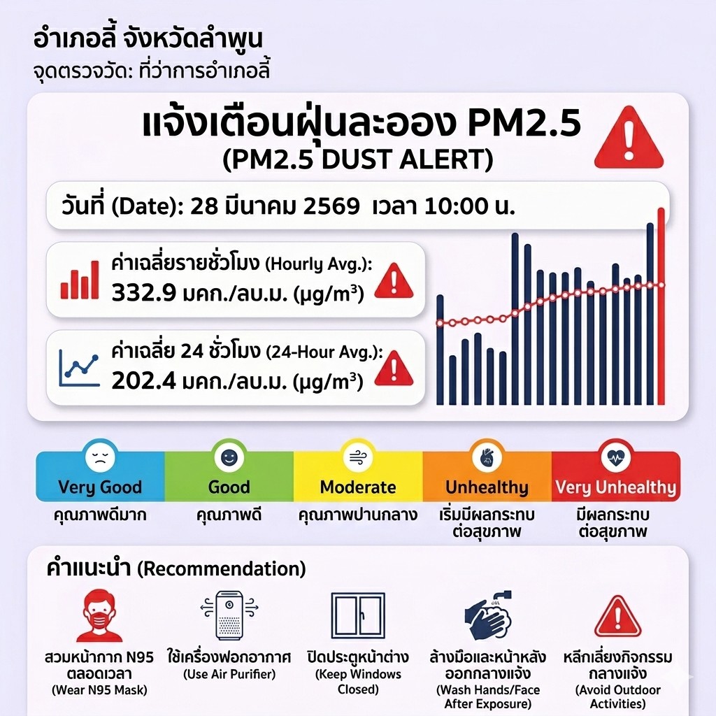 วันนี้ (28 มีนาคม 2569) ผมมีรายงานสถานการณ์ฝุ่น PM2.5 ที่น่าเป็นห่วงอย่างมากจากพื้นที่ อำเภอลี้ จังหวัดลำพูน มาแจ้งเตือนครับ โดยข้อมูลล่าสุดจากจุดตรวจวัด ณ ที่ว่าการอำเภอลี้ เมื่อเวลา 10:00 น. ระบุค่าฝุ่นที่พุ่งสูงจนอยู่ในเกณฑ์วิกฤต ดังนี้ครับ: