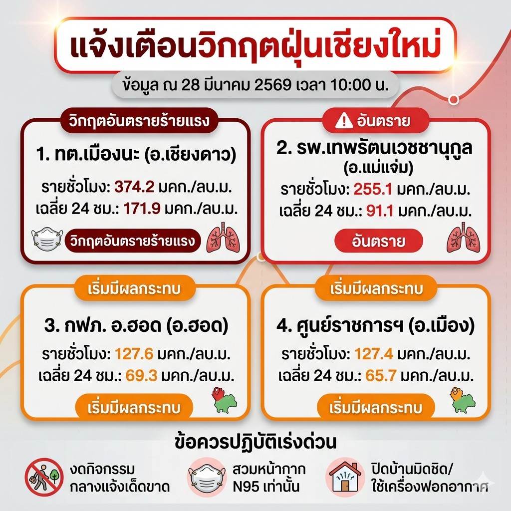 สถานการณ์ฝุ่น PM2.5 ในจังหวัดเชียงใหม่เช้านี้ (28 มีนาคม 2569) เข้าขั้น "วิกฤตระดับสูงสุด" ในรอบปีเลยครับ ตัวเลขพุ่งสูงจนน่าตกใจทั้งแบบรายชั่วโมงและค่าสะสมต่อเนื่อง ผมจึงรวบรวมสถานการณ์จากสถานีตรวจวัดหลักทั้ง 4 แห่งที่กำลังเผชิญศึกหนักมาแจ้งเตือนกันครับ