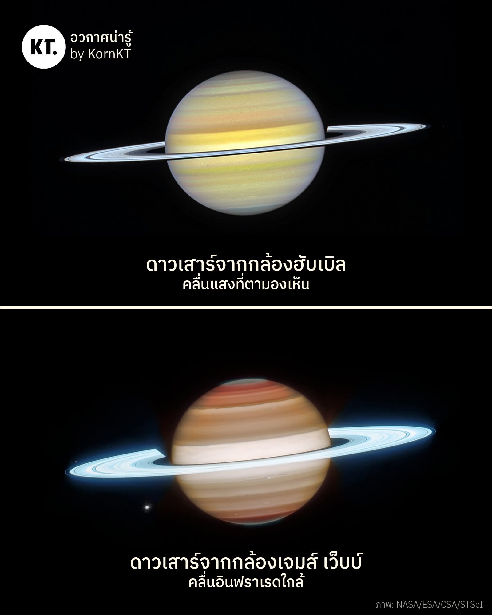 ดาวเสาร์จากกล้องฮับเบิล คลื่นแสงที่ตามองเห็น และ ดาวเสาร์จากกล้องเจมส์ เว็บบ์ คลื่นอินฟราเรดใกล้
