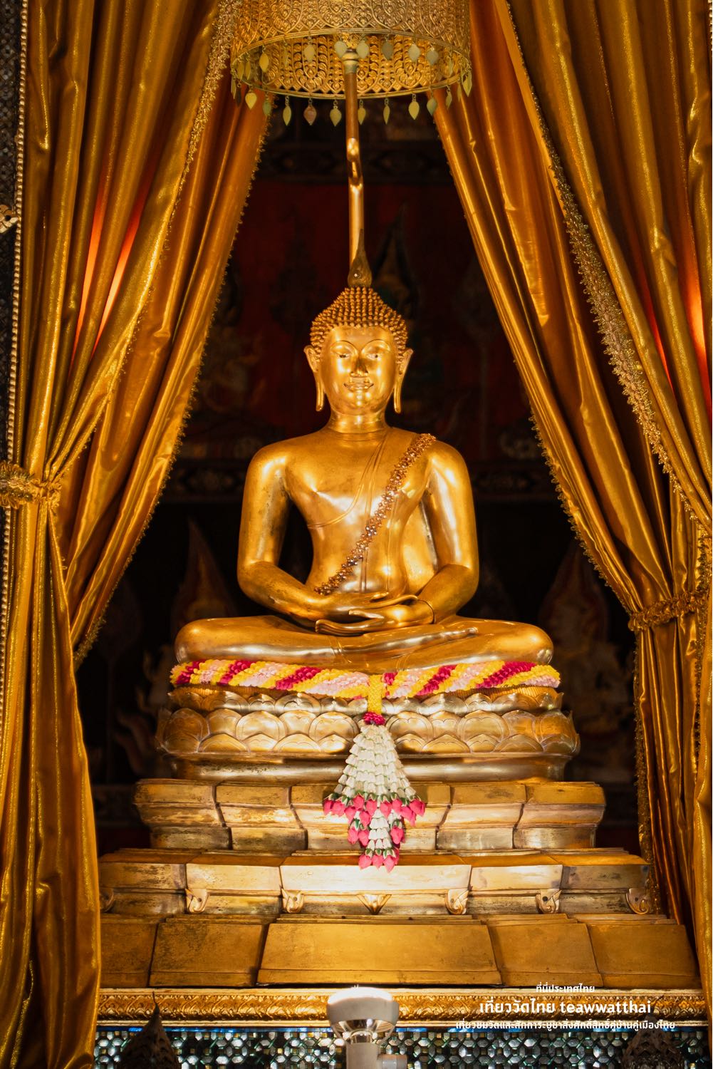 พระพุทธรูปหล่อด้วยสำริดกะไหล่ทอง ประทับนั่งขัดสมาธิราบบนฐานปัทม์ แสดงปางสมาธิ ขนาดสูงพร้อมฐาน ๑๓๕ เซนติเมตร หน้าตักกว้าง ๖๓ เซนติเมตร (องค์พระสูง ๗๙ เซนติเมตร)