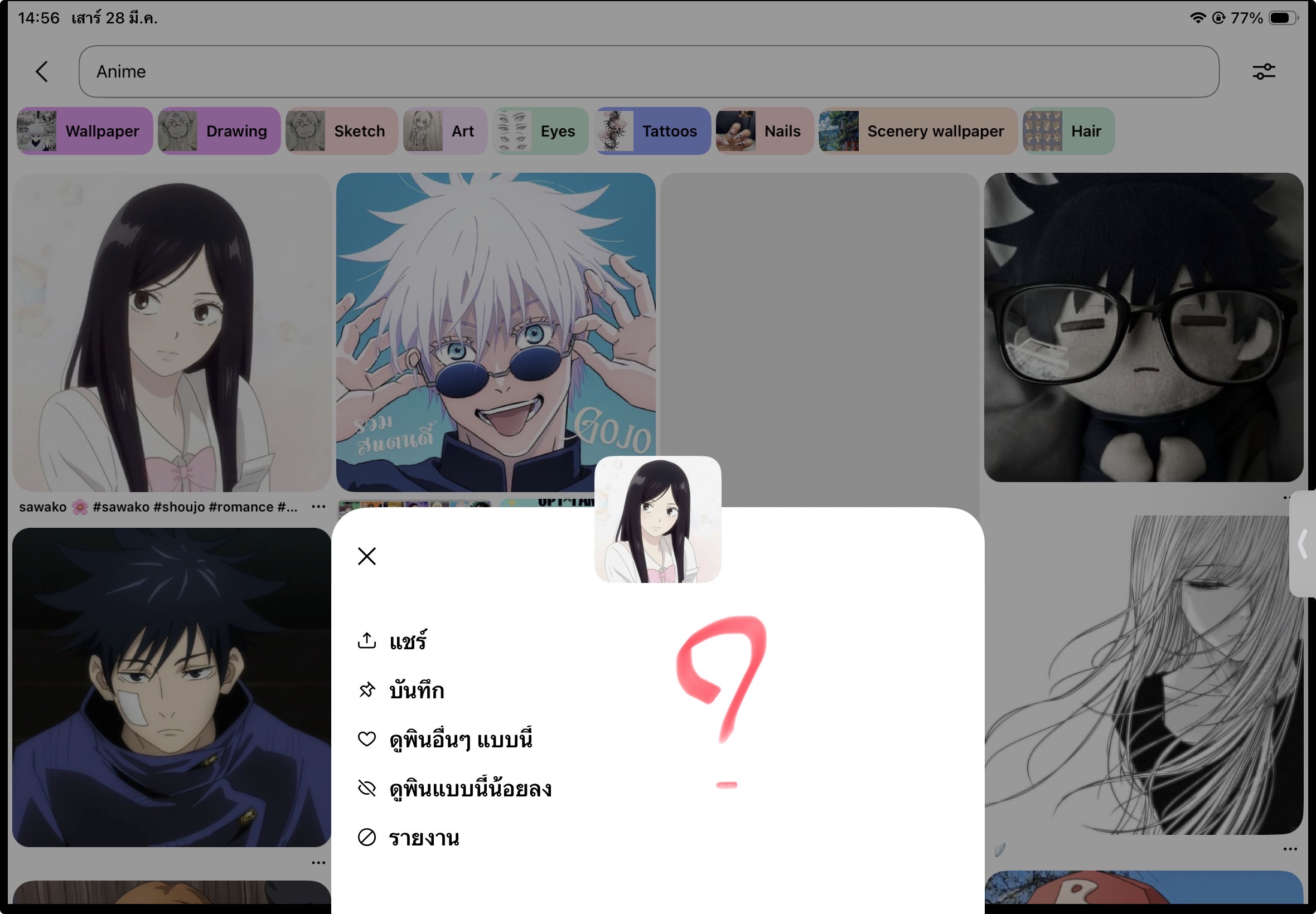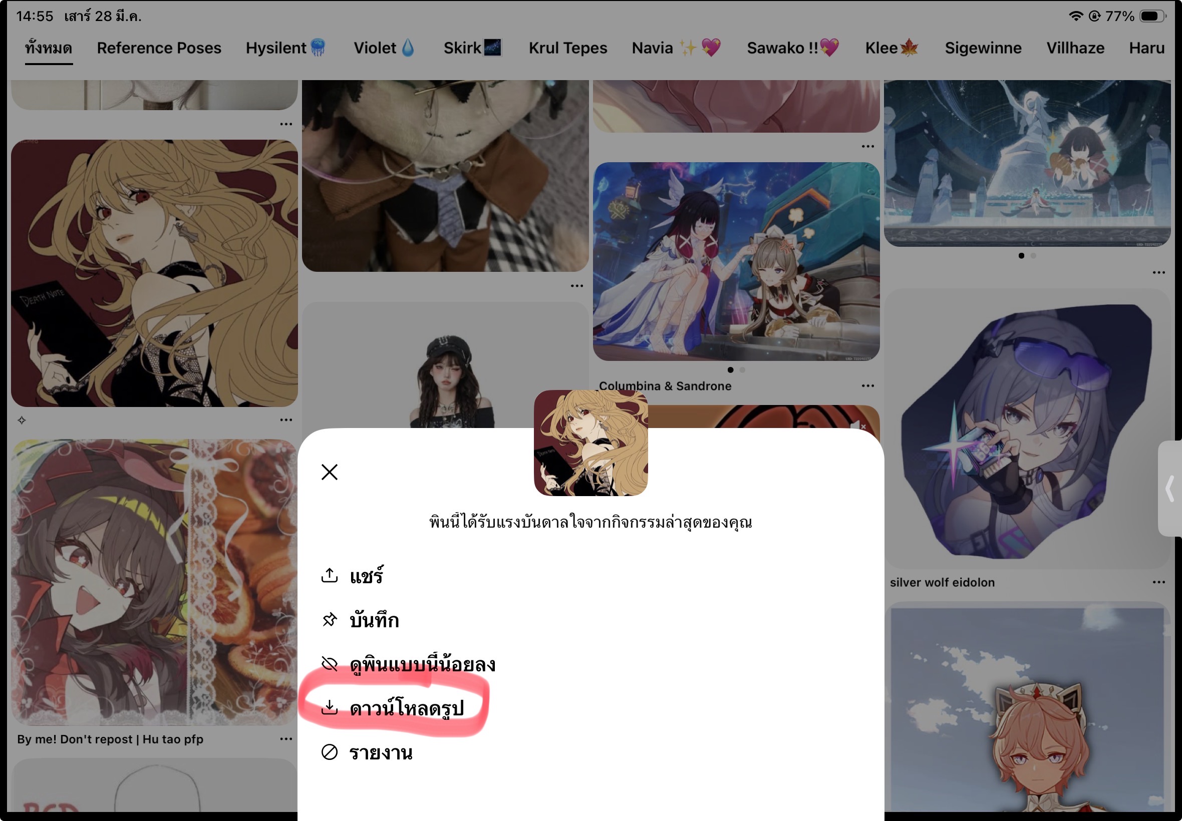 คือเราจะใช้ไอแพดบันทึกรูปในพินอ่ะค่ะ ทีนี้พอกดสามจุดมุมขวาบนแล้วมันไม่มีให้บันทึกภาพนอกจากตัวเลือก 1.ส่ง 2.ซ่อน 3.รายงาน แค่นี้ค่ะ ตอนแรกเรานึกว่าโทรศัพท์ก็น่าจะเป็นด้วยมั้ง เราเลยไม่ได้คิดอะไรมาก แต่