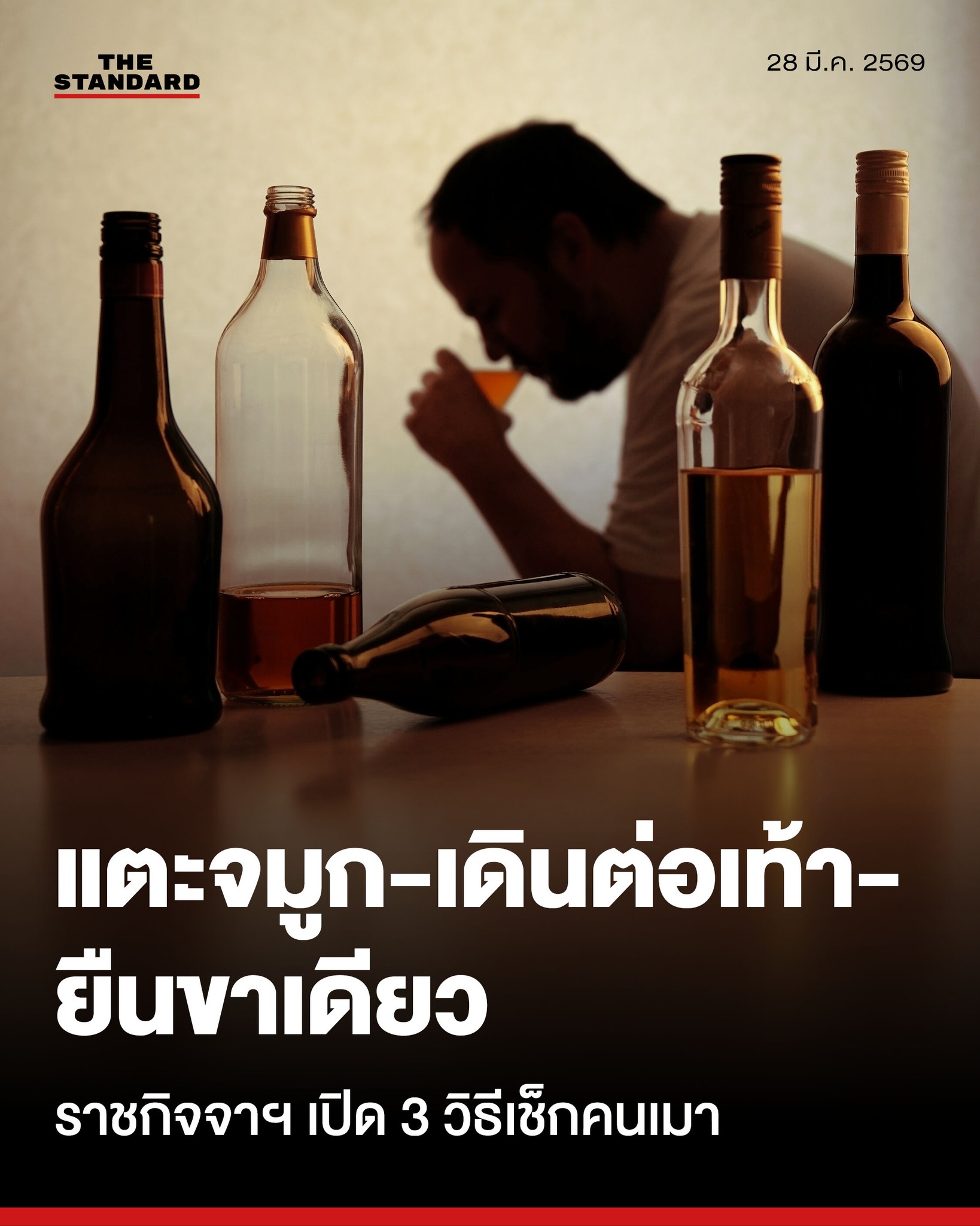 ⚈ มีกลิ่นแอลกอฮอล์ออกจากร่างกาย ร่วมกับอาการทางกายภาพ เช่น ตาแดงก่ำ ตากระตุก เดินไม่ตรงทาง หรือมือสั่น