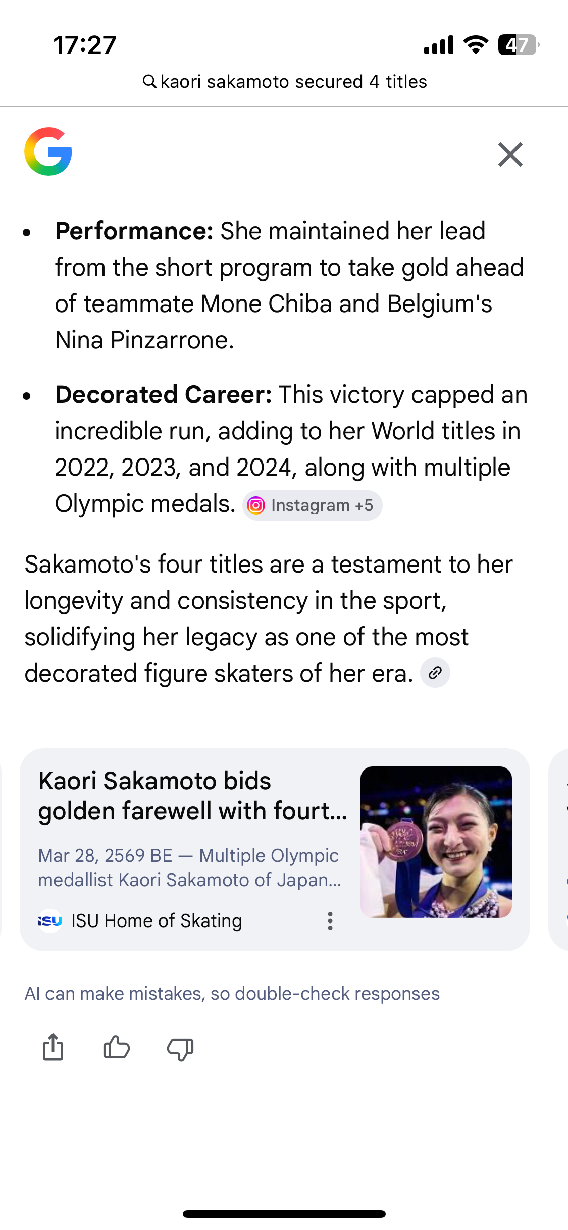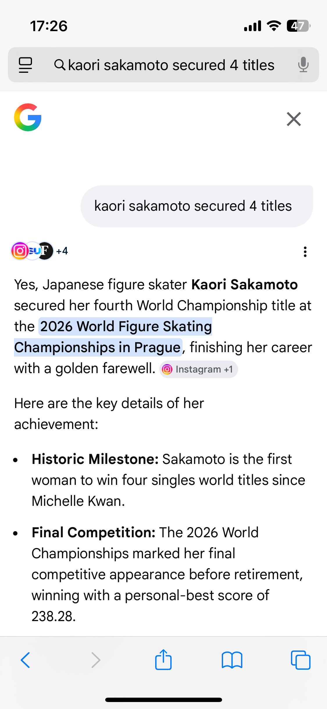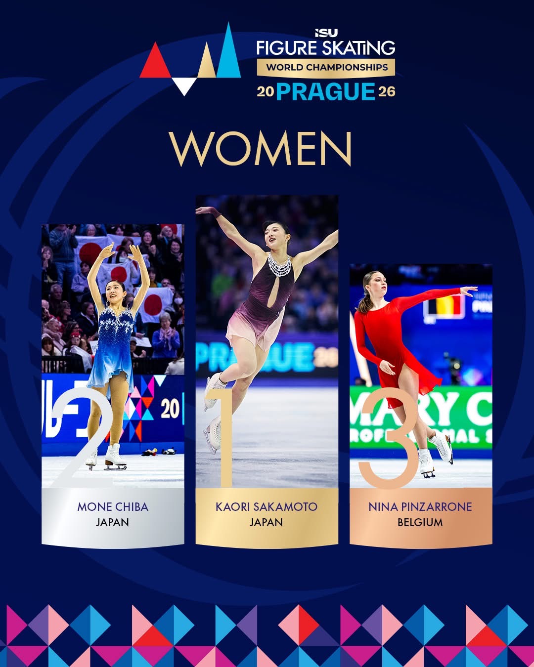 Kaori Sakamoto สร้างประวัติศาสตร์ในการแข่งขันสเก็ตน้ำแข็งลีลาชิงแชมป์โลก 2026 ณ กรุงปราก ประเทศสาธารณรัฐเช็ก ด้วยการคว้าเหรียญทองหรือแชมป์โลกในการแข่งขันประเภทหญิงเดี่ยวได้เป็นสมัยที่ 4 ซึ่งถือว่ามากที่สุดในประวัติศาสตร์นักสเก็ตน้ำแข็งลีลาหญิงเดี่ยวของญี่ปุ่นที่เคยคว้าแชมป์โลกมาแล้วในอดีต ปิดฉากการอำลาของเธอในการแข่งขันสเก็ตน้ำแข็งลีลาหญิงเดี่ยวครั้งสุดท้ายนี้อย่างสวยงาม ขอแสดงความยินดีกับ Kaori Sakamoto ด้วยครับ 😭
