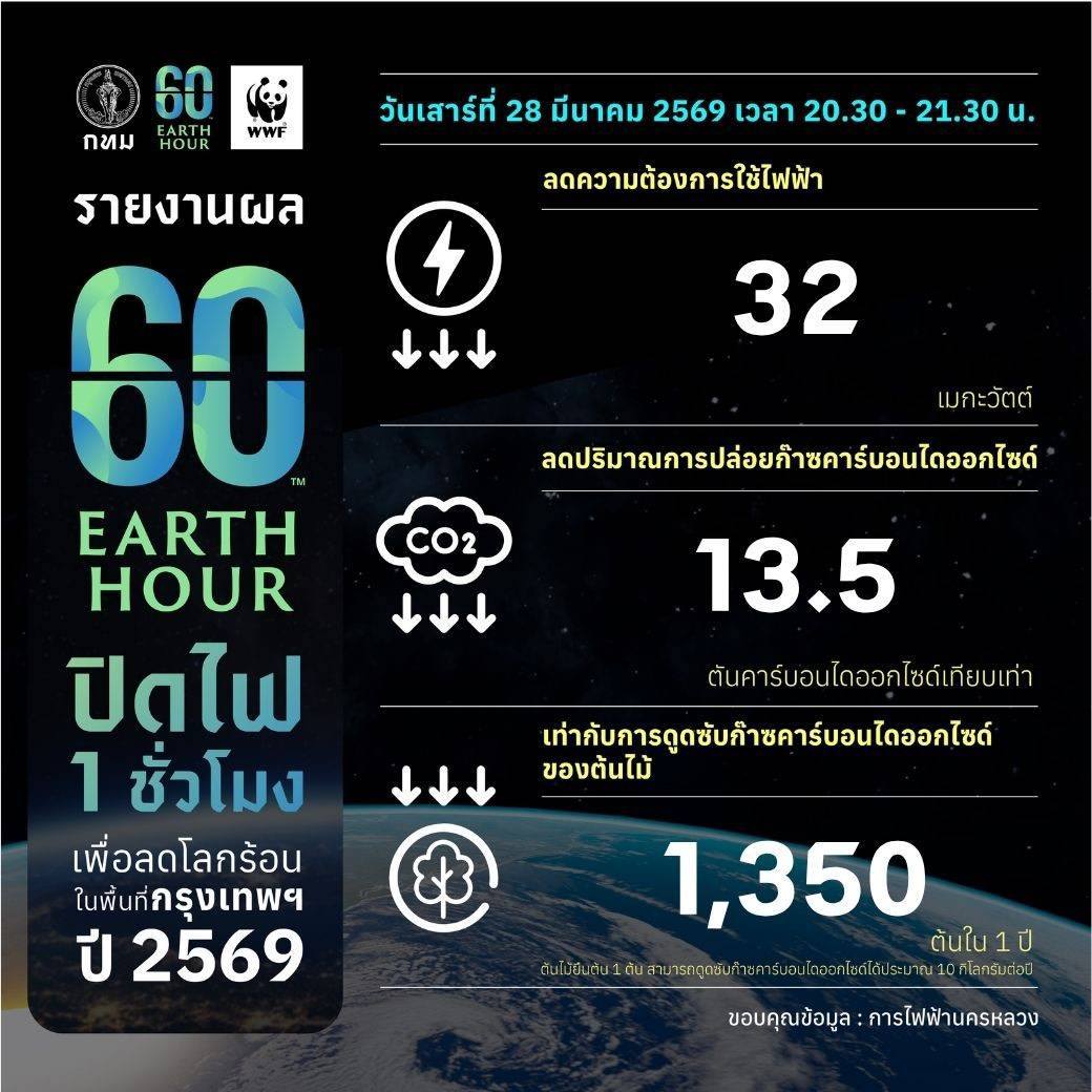 ผลการคำนวณปริมาณการใช้ไฟฟ้าช่วงเวลาดังกล่าวในพื้นที่กรุงเทพฯ โดยการไฟฟ้านครหลวง พบว่า สามารถลดการใช้ไฟฟ้าลงได้ 32 เมกะวัตต์ เมื่อเทียบกับการใช้ไฟฟ้าในพื้นที่กรุงเทพฯ ในวันเสาร์ก่อนหน้า คือวันเสาร์ที่ 21 มีนาคม 2569 ในช่วงเวลาเดียวกัน โดยสามารถลดค่าไฟฟ้าลงได้ 144,958 บาท ลดปริมาณการปล่อยก๊าซคาร์บอนไดออกไซด์ได้ 13.5 ตันคาร์บอนไดออกไซด์เทียบเท่า เทียบได้กับการดูดซับก๊าซคาร์บอนไดออกไซด์ของต้นไม้ 1,350 ต้น ใน 1 ปี (ไม้ยืนต้น 1 ต้น สามารถดูดซับก๊าซคาร์บอนไดออกไซด์ได้ประมาณ 10 กิโลกรัมต่อปี) เทียบกับเที่ยวบินกรุงเทพฯ – เชียงใหม่ จำนวน 112 เที่ยวบิน หรือการใช้รถยนต์ดีเซลเป็นระยะทาง 81,000 กิโลเมตร หรือเทียบกับการปิดไฟครัวเรือน 60,750 ครัวเรือน