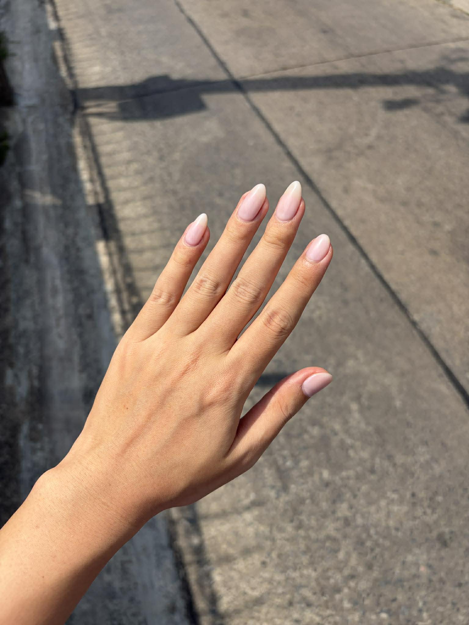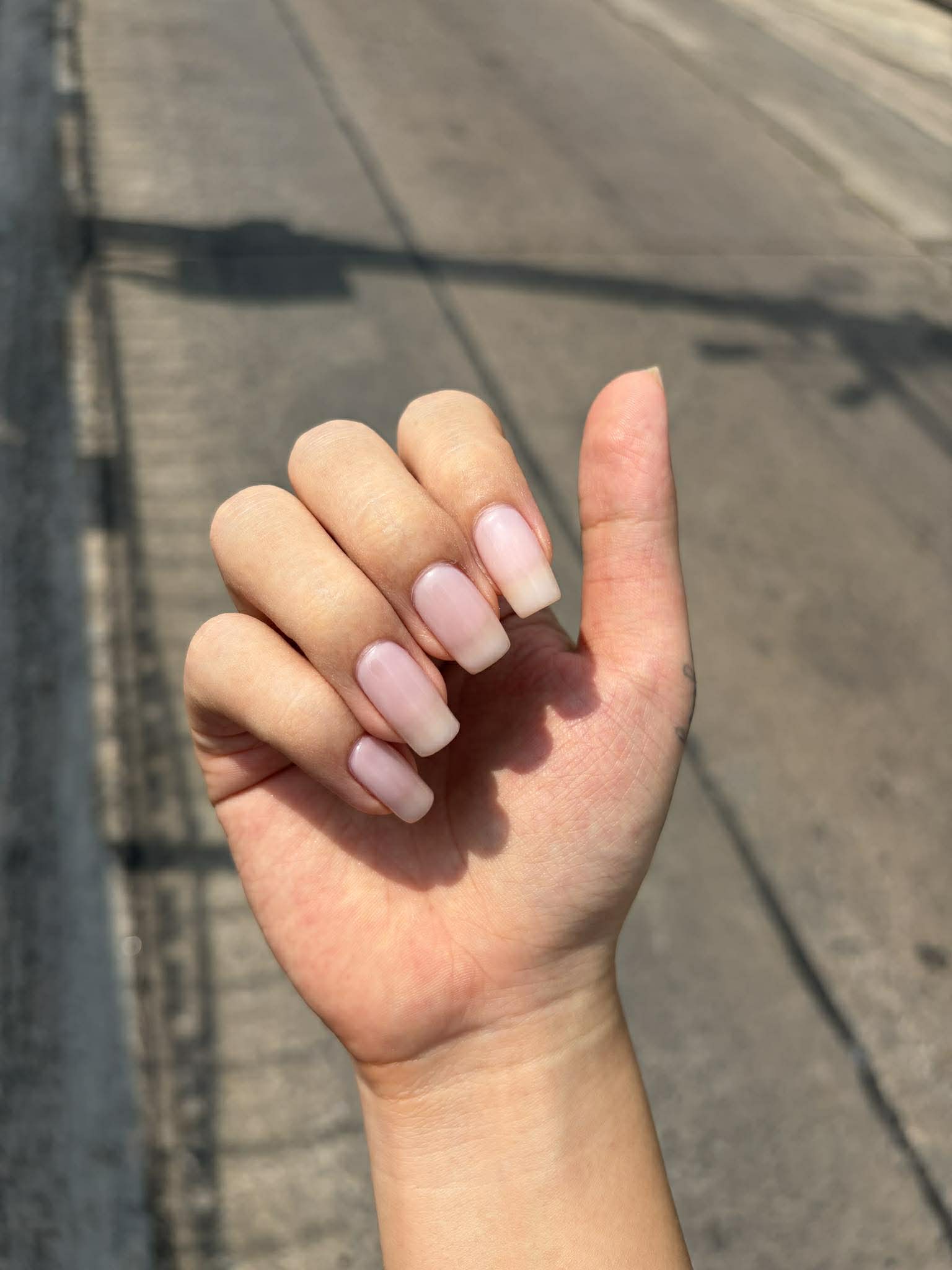 ปกติเราจะทำสีที่ค่อนข้างชัด เช่นสีแดง สีฟ้า สีชมพู แต่ตอนนี้ เรารู้สึกว่าเราอยากทำสีเรียบๆ ธรรมชาติๆ ดูไม่ได้หวือหวา อลังการอะไรมาก จึงใช้เป็นสีไซรัป สีขาวนมๆ ชมพูๆ พอทาลงเล็บแล้ว สีออกมาธรรมชาติมาก สีเหมือนดอกไลแลค มีความม่วงอ่อน เพราะเป็นสีที่ใส โปร่งมาก เราจะยังเห็นเนื้อเล็บที่ยาวออกมาอยู่ ซึ่งตัวเราไม่ติดค่ะ เพราะอยากได้ฟีลนี้อยู่แล้ว โดยเรารีเควสช่างว่าขอทำทรงเล็บมือแต่ละข้างต่างกัน ซ้ายเป็นทรงอัลมอนด์ ขวาเป็นทรงเหลี่ยม 555 ช่างก็งงไปเลยค่ะ เพราะช่างไม่เคยทำ แต่เราก็ยืนยันจะทำ และนี่คือผลลัพธ์ค่ะ ช่างเรียกเราว่า "หญิงสาวสองบุคคลิก" 555