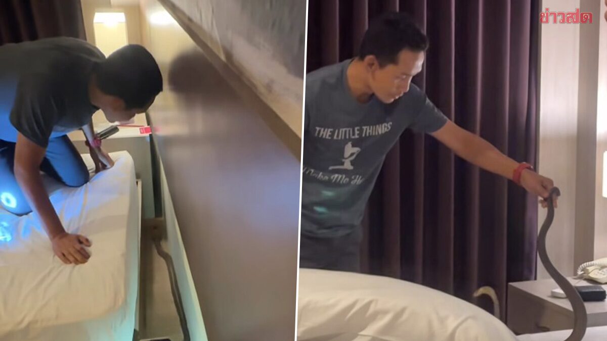 งูเห่า โผล่บนที่นอน เย็นวาบเลื้อยผ่านคอ ขณะนอนหลับที่โรงแรม เรียกเจ้าหน้าที่มาช่วยจับ ใช้เวลาไม่นาน พบซุกตัวอยู่หัวเตียง