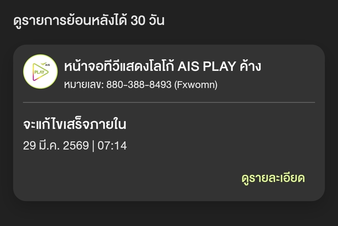 ตอนนี้กล่อง ais play box ใช้งานอะไรไม่ได้เลยค่ะ มันขึ้นโลโก้ Aisplay ค้างสลับกับไม่มีสัญญาณติดๆดับๆวนอย่างงี้ แก้ยังไงก็ไม่หาย เลยโทรติดต่อ ais แต่ทาง ais แจ้งว่าให้ส่งเรื่องใน myais ตอนนี้ส่งไป 1 วันแล้วก็ยังค้างแบบนี้อยู่เลยค่ะ คือกล่องใช้ไม่ได้ทีวีก็ดูไม่ได้มา 1 วันแล้วค่ะ พอแจ้งอะไรก็ส่งแต่วิธีแก้ปัญหาเบื้องต้นมาอย่างเดียว ทั้งที่เราก็บอกว่าทำหมดแล้วแต่กล่องมันใช้ไม่ได้จริงๆ