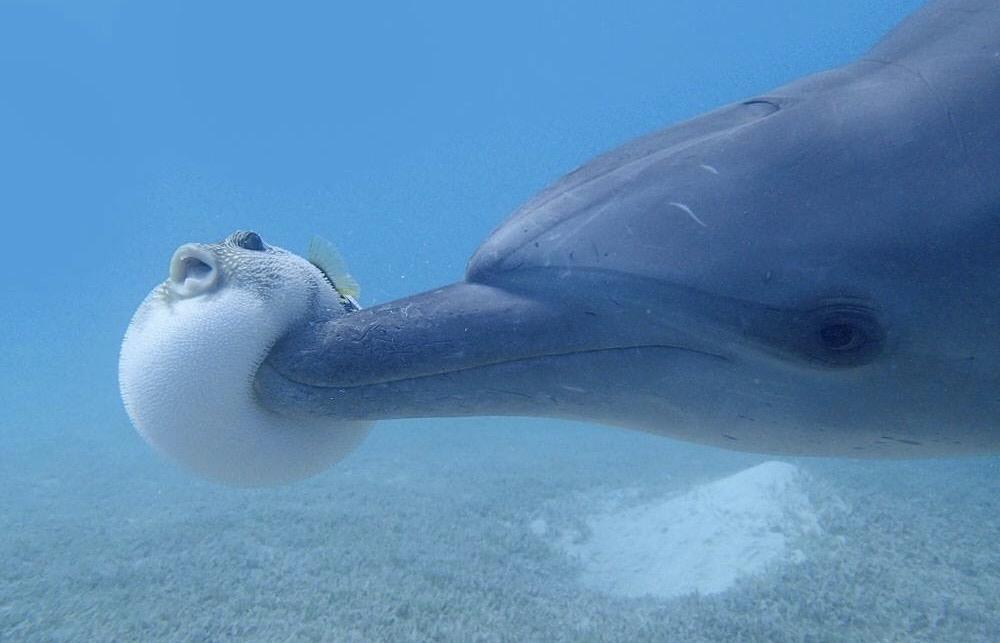 เคยเห็นหลายคลิปที่มีปลาโลมาชอบเข้าไปเล่นปลาปักเป๊าเพื่อให้มึนเมา