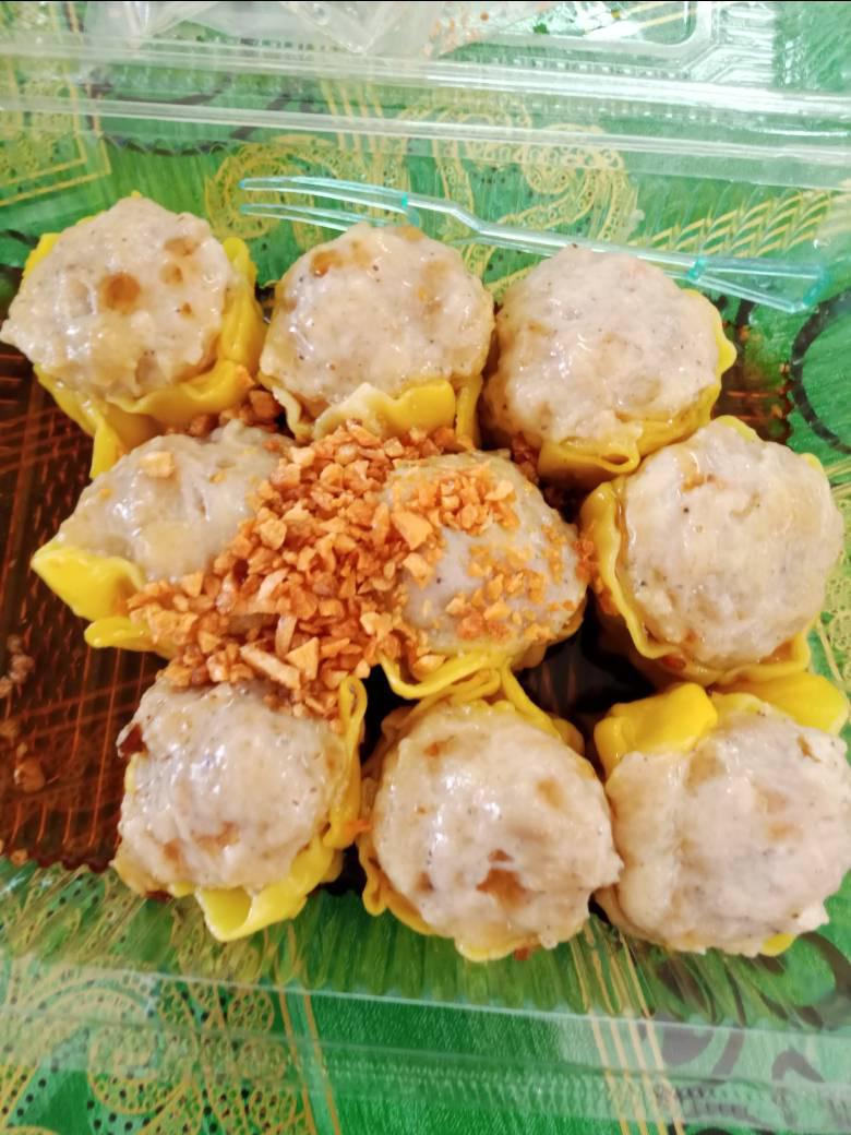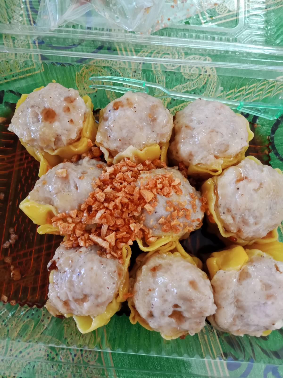 ขนมจีบ ลูกละ 5 บาท ซื้อมา 10 ลูก ใส่น้ำจิ้มหวาน + จิ๊กโฉ่ว มาเลย ที่ร้านบอกว่า กระเทียมเจียวที่ร้านปั่นเอง เจียวเอง ถึงว่าหอมฟุ้งเลย หมูด้านใน เหมือนใส่มันแกวกรุบ ๆ หอมสามเกลอ 10 ลูกก็อยู่ท้องยามเช