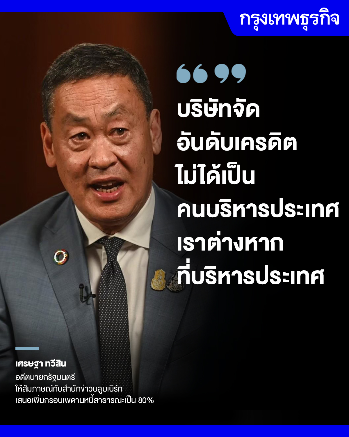— เศรษฐา ทวีสิน อดีตนายกรัฐมนตรีให้สัมภาษณ์กับสำนักข่าวบลูมเบิร์ก เสนอเพิ่มกรอบเพดานหนี้สาธารณะเป็น 80%