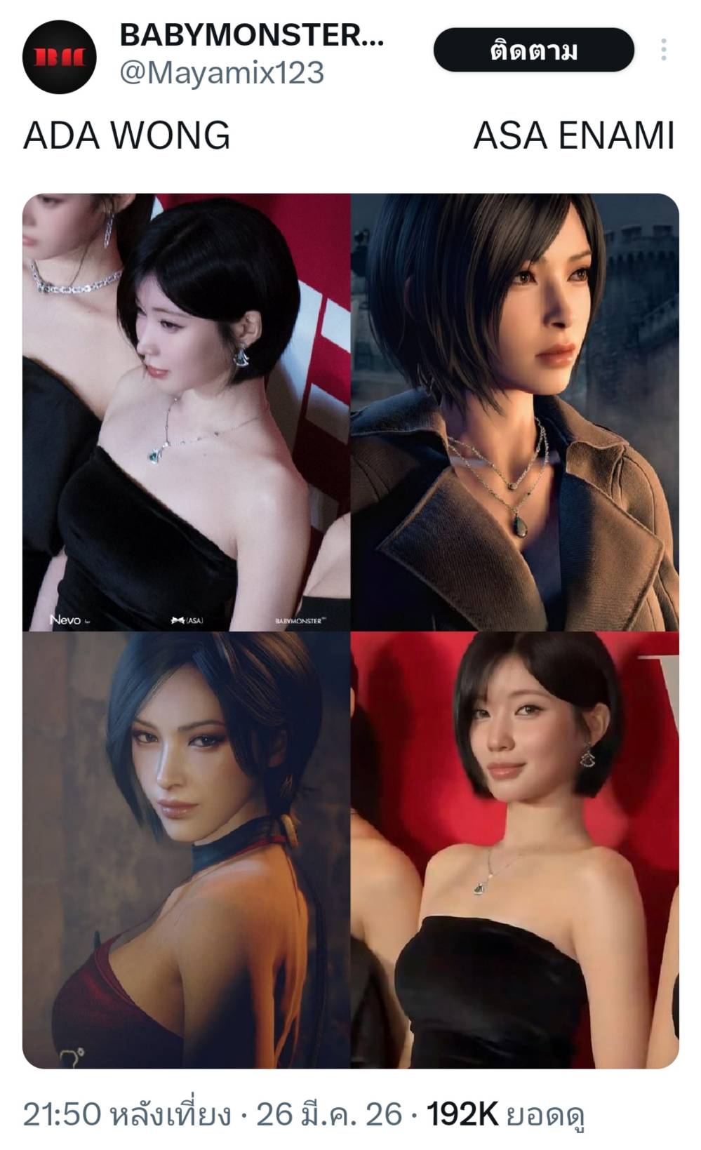 ASA BABYMONSTER กำลังเป็นไวรัลอย่างหนักในโลกโซเชียลว่าบุคลิกลักษณะและหน้าตาและท่าทางคล้าย Ada Wong จากเกมฮิต Resident Evil