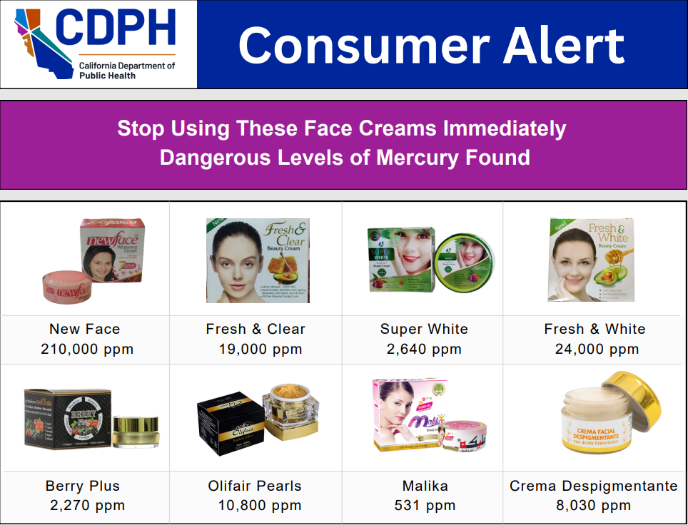 กรมสาธารณสุขแห่งรัฐแคลิฟอร์เนีย California Department of Public Health (CDPH) ออกประกาศเตือนผู้บริโภคอเมริกัน หลังตรวจพบครีมบำรุงผิวหน้าจากประเทศไทยหลายยี่ห้อมีการ ปนเปื้อนปรอท ในระดับที่เป็นอันตราย โดยใช้เครื่องตรวจวิเคราะห์แบบ X-Ray Fluorescence (XRF)