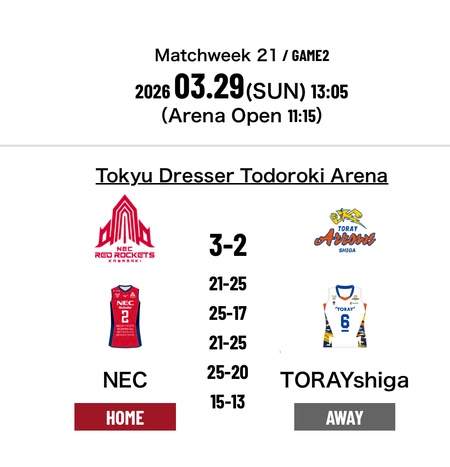 2.NEC Red Rockets Kawasaki 3-2 Toray Arrows Shiga (21-25 25-17 21-25 25-20 15-13)