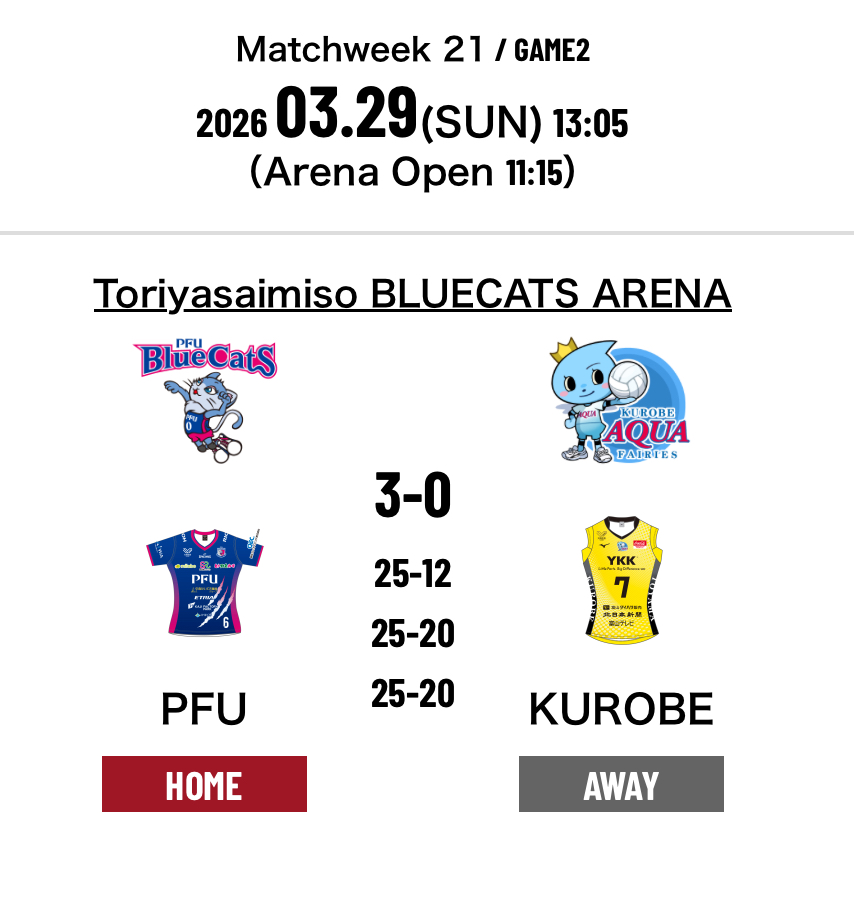 3.PFU Blue Cats Ishikawa Kahoku 3-0 Kurobe Aqua Fairies (25-12 25-20 25-20)