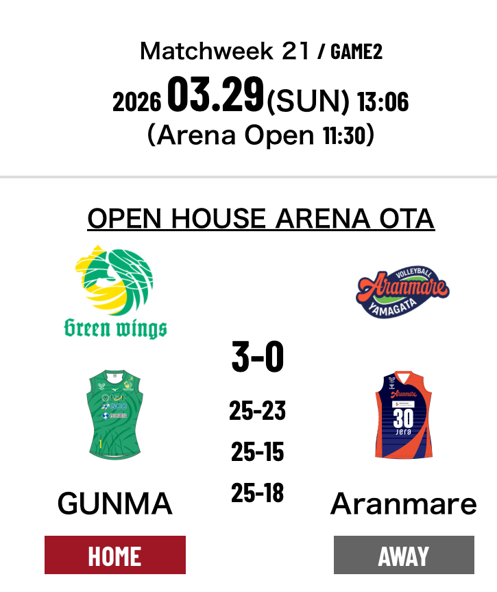 4.Gunma Bank Green Wings 3-0 Aranmare Yamagata (25-23 25-15 25-18)