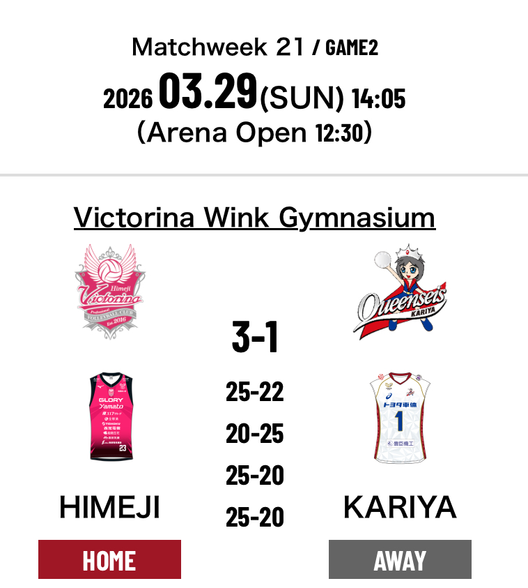 6.Victorina Himeji 3-1 Queenseis Kariya (25-22 20-25 25-20 25-20)