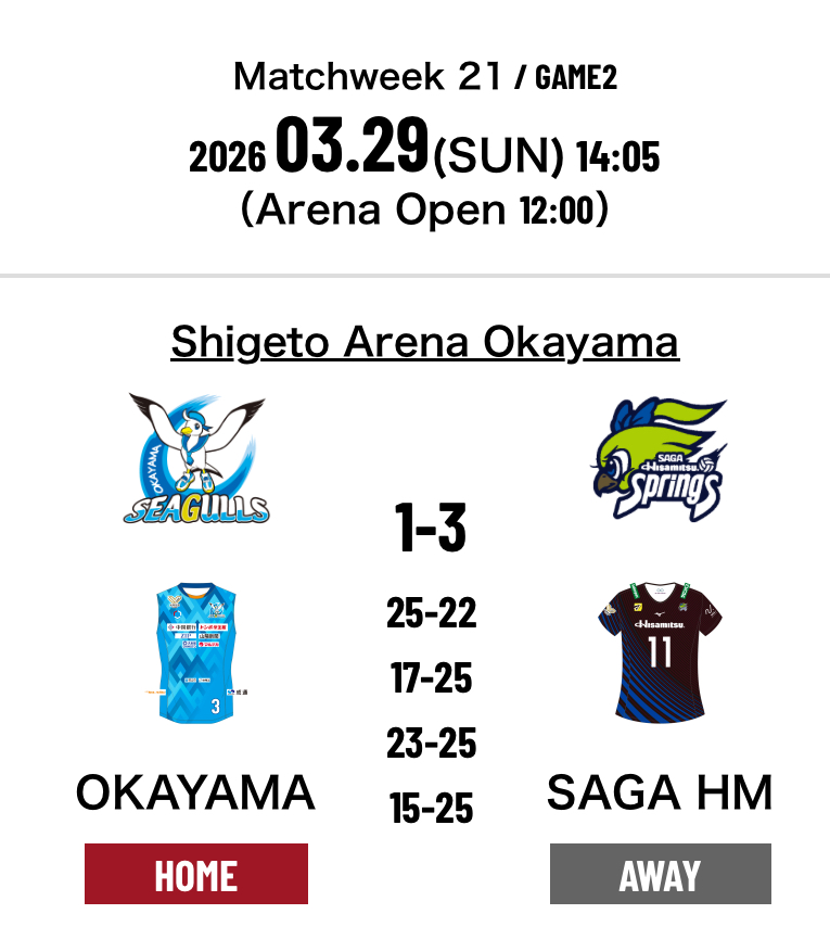 7.Okayama Seagulls 1-3 SAGA Hisamitsu Springs (25-22 17-25 23-25 15-25)