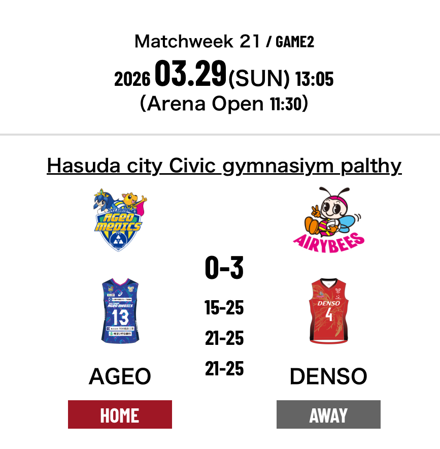 1.Saitama Ageo Medics 0-3 Denso Airybees (15-25 21-25 21-25)