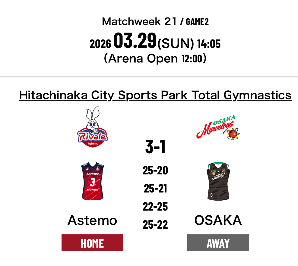 5.Astemo Rivale Ibaraki 3-1 Osaka Marvelous (25-20 25-21 22-25 25-22)