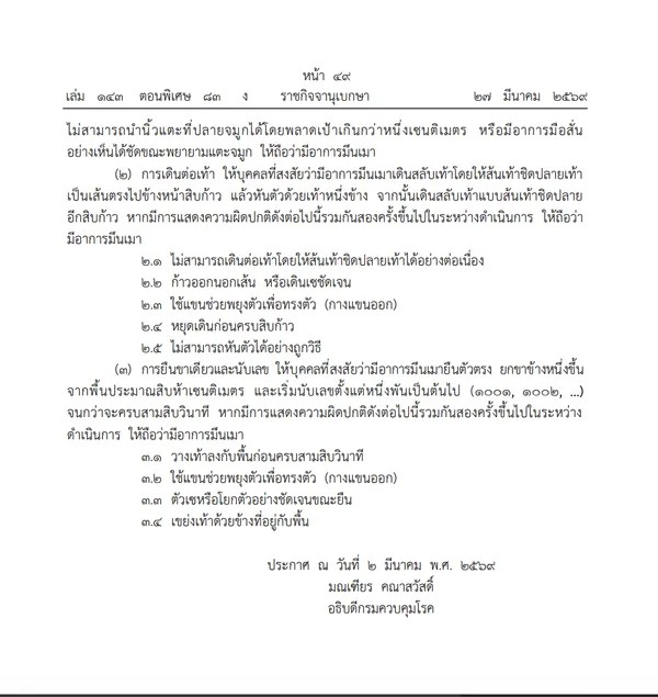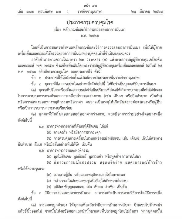 27 มีนาคม 2569 ราชกิจจานุเบกษาเผยแพร่ประกาศกรมควบคุมโรค กำหนดมาตรฐานการตรวจสอบอาการมึนเมา พ.ศ. 2569