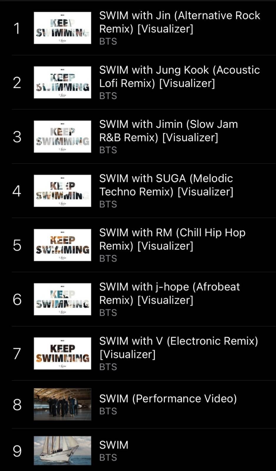 BTS ส่งวิดีโอรูปแบบ Visualizer ของเพลง "SWIM" ในเวอร์ชันรีมิกซ์ต่าง ๆ ของเมมเบอร์ทั้ง 7 คน เข้ายึดครอง 7 อันดับแรกบนชาร์ต iTunes US Music Videos ได้สำเร็จ โดยความพิเศษคือแต่ละเวอร์ชันถูกนำเสนอผ่านสไตล์ดนตรีที่แตกต่างกันตามเอกลักษณ์ของสมาชิกแต่ละคน ดังนี้: