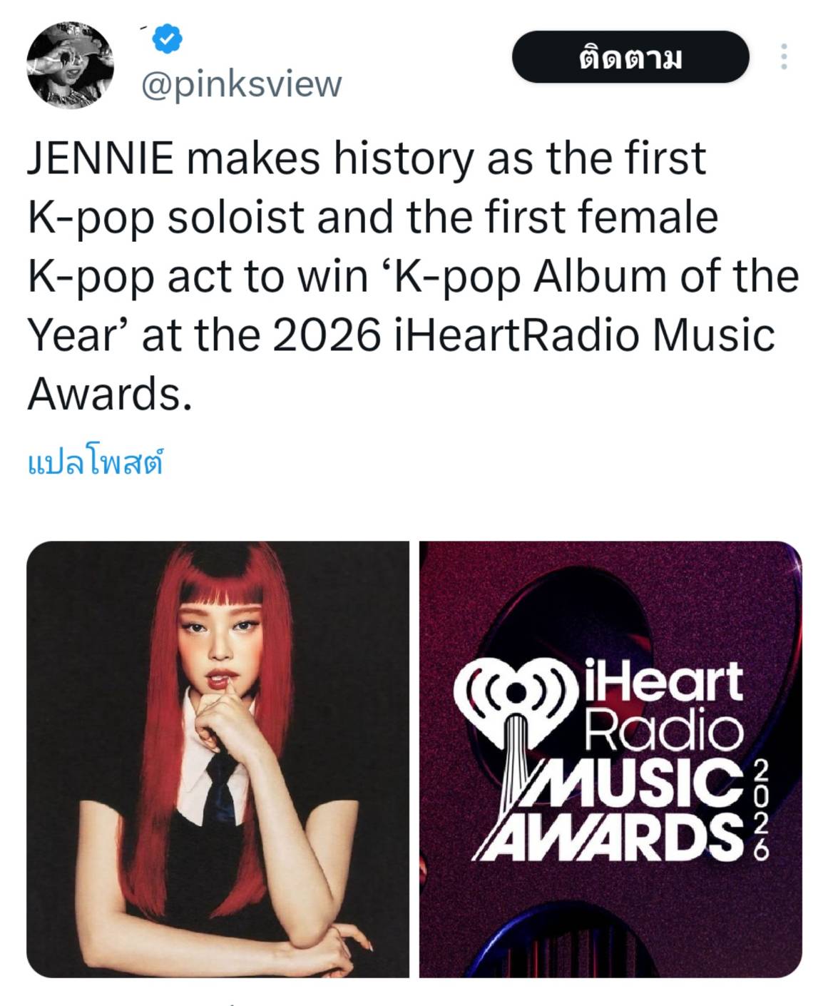 [กระทู้ยินดี] ROSÉ x JENNIE คว้ารางวัล iHeartRadio 2026 พร้อมกัน