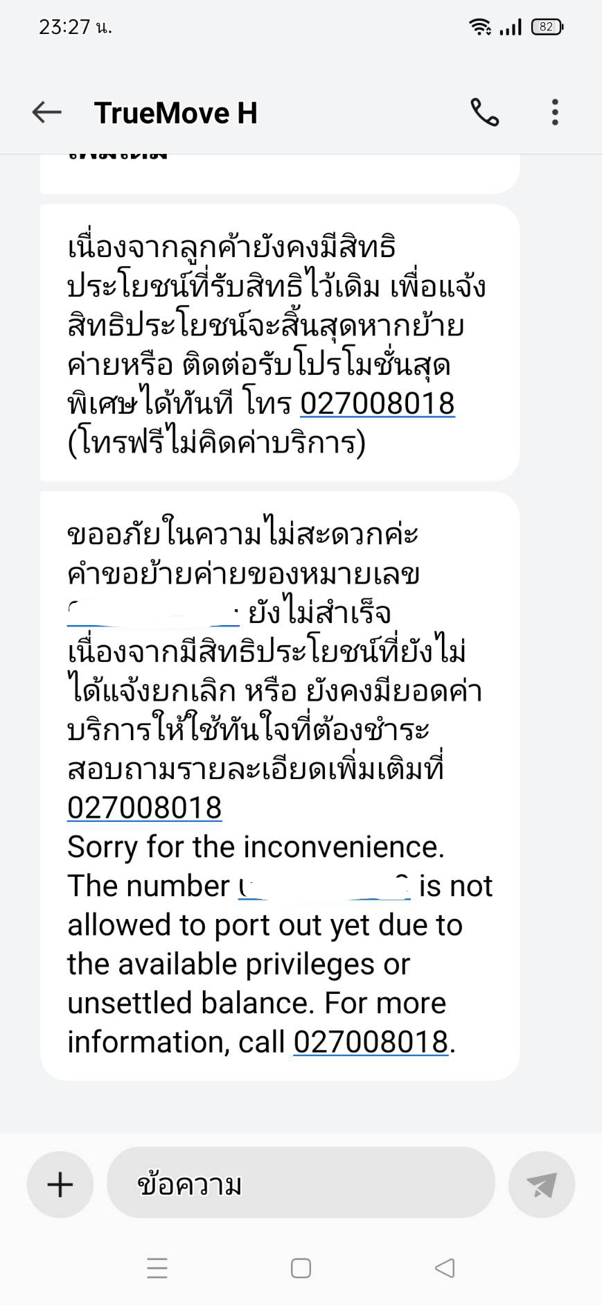 แต่ล่าสุด มี SMS ส่งเข้ามาอีกครั้ง เนื้อหาเหมือนเดิม ว่าเรามียอดค้างชำระ ทำให้ไม่สามารถย้ายค่ายได้