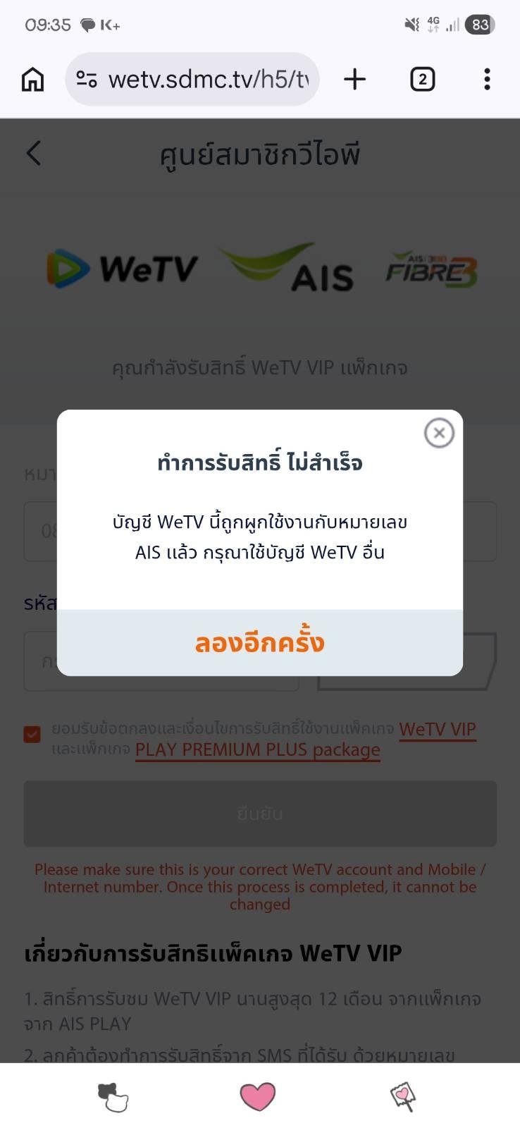 สมัครแพ็คเกจ Ais play asian ดูได้ 3แอปพลิเคชั่น viu iqiyi และ wetv รายปีไว้ พอถึงเวลาต่ออายุระบบAIS ต่ออายุรายปีให้อัตโนมัติ หมดอายุ 05/03/2570 แต่มีแค่แอป Wetv ที่ใช้งาน vip ไม่ได้ ลงทะเบียนผ่านลิ้งค์ที่ทางAisให้ลงทะเบียนกับ WeTV แล้วก็ยังรับสิทธิ์ไม่สำเร็จ ไม่ทราบว่าต้องแก้ไขยังไงคะ สอบถามไปทางแชทwetv ไม่มีแอดมินตอบคำถามเลย มีช่องทางการติดต่ออื่นๆไหมคะ