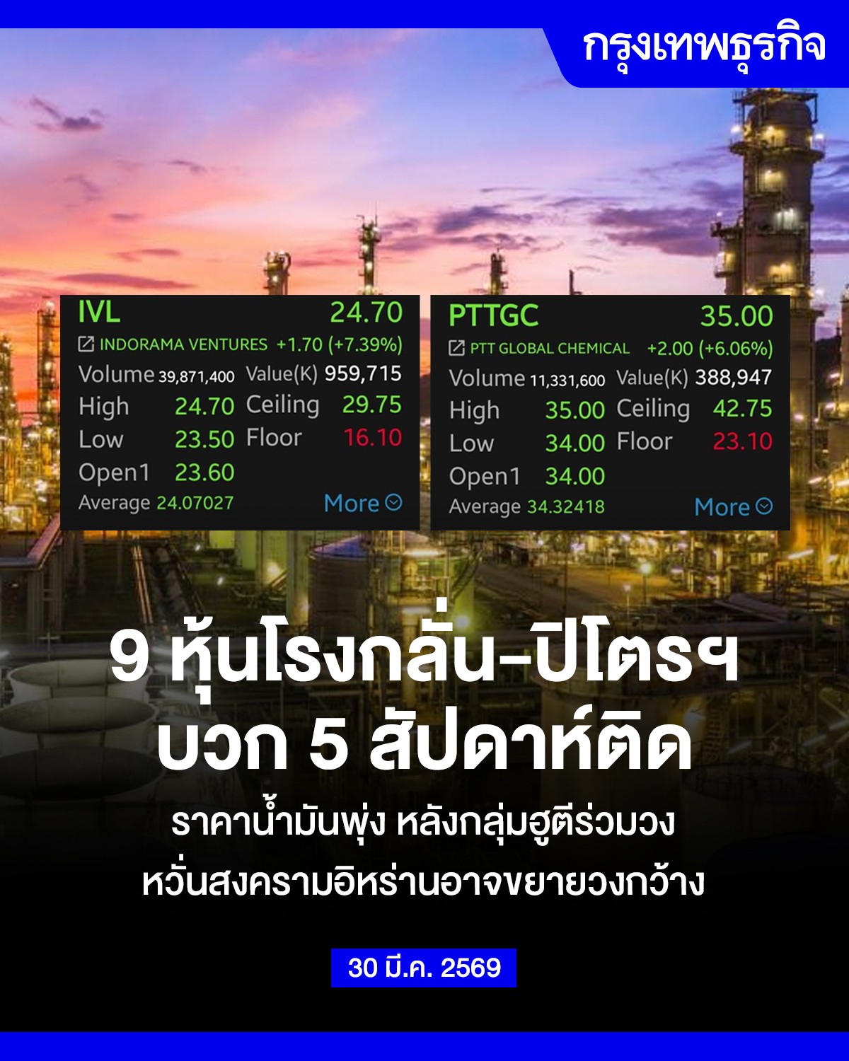 ความเคลื่อนไหวตลาดหุ้นไทยภาคเช้า ณ วันที่ 30 มี.ค.2569 เวลา 10.05 น.หุ้นกลุ่มโรงกลั่นและปิโตรเคมี กอดคอบวกต่อสัปดาห์ที่ 5 นำโดย