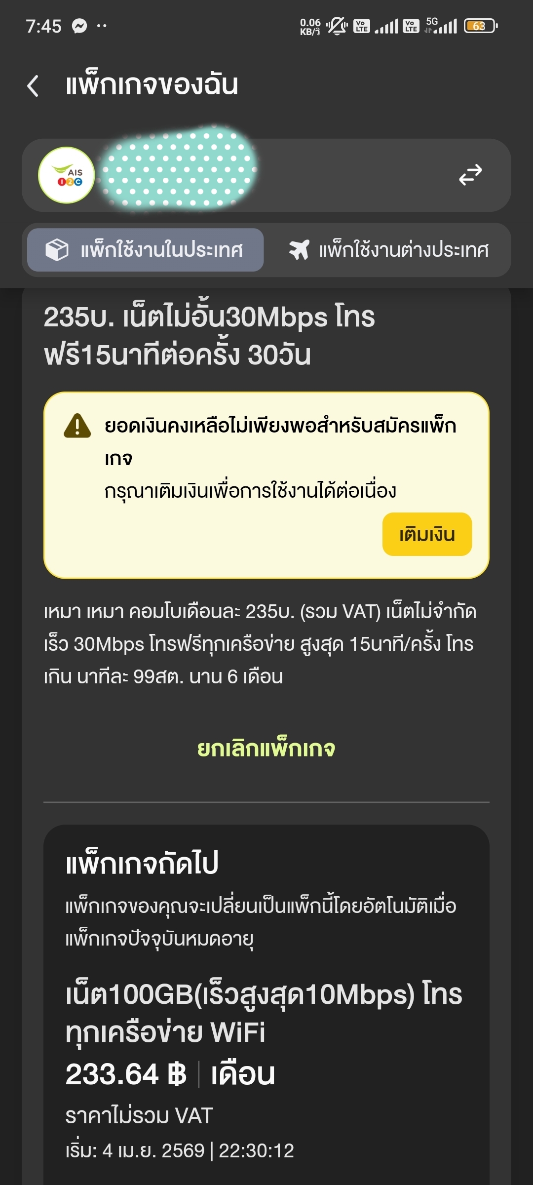 มีแต่เพียงแพ็กเกจถัดไป(250 บาท เน็ต 10mbps 100GB)ที่ระบุว่า แพ็กเกจของคุณจะเปลี่ยนเป็นแพ็กนี้อัตโนมัติเมื่อแพ็กเกจปัจจุบันหมดอายุ เริ่ม 4 เม.ย.2569 20.30.12 น.
