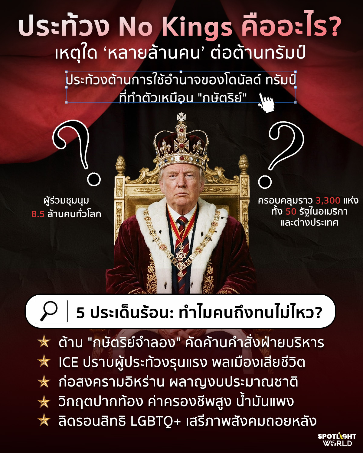 - ทรัมป์เขาทำตัวเหมือนเป็นกษัตริย์จำลอง คนเลยเรียกการประท้วงครั้งนี้ว่า "No Kings" เกิดขึ้นมาตั้งแต่ประมาณเดือนมิถุนายนปีที่แล้ว ไล่เลี่ยกันกับเหตุการณ์ตอนที่ไทยรับมือกับการปะทะชายแดนจากกัมพูชา