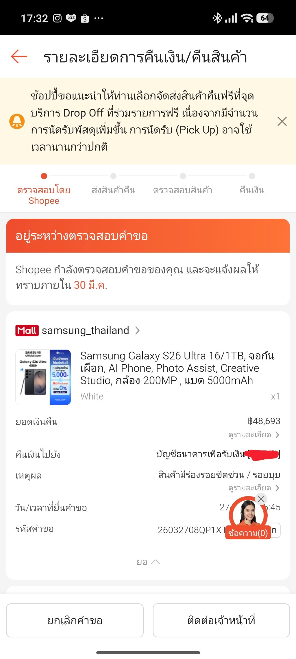 ส่งคำขอ ขอคืนสินค้า shopee ระบบแจ้งว่าจะแจ้งผล 30มีนาคม ถึงวันเงียบกริ๊ป